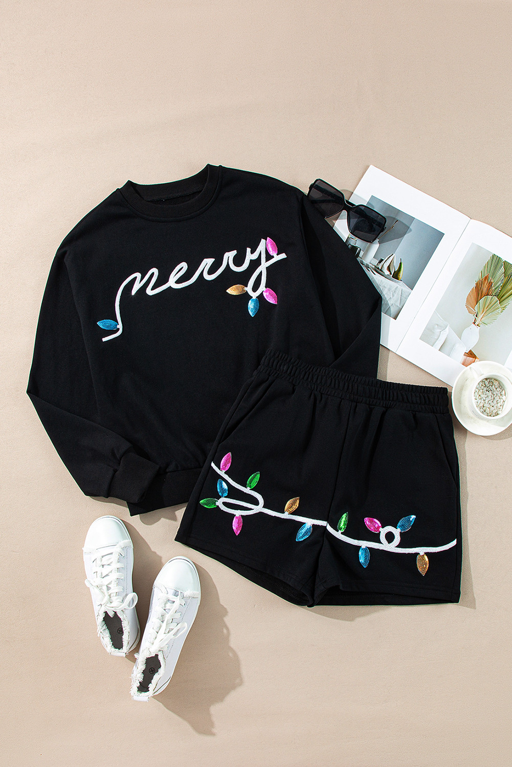 Faites une déclaration avec cette charmante tenue de pull et de short à paillettes Merry Graphic, parfaite pour ajouter une touche de glamour à votre garde-robe.