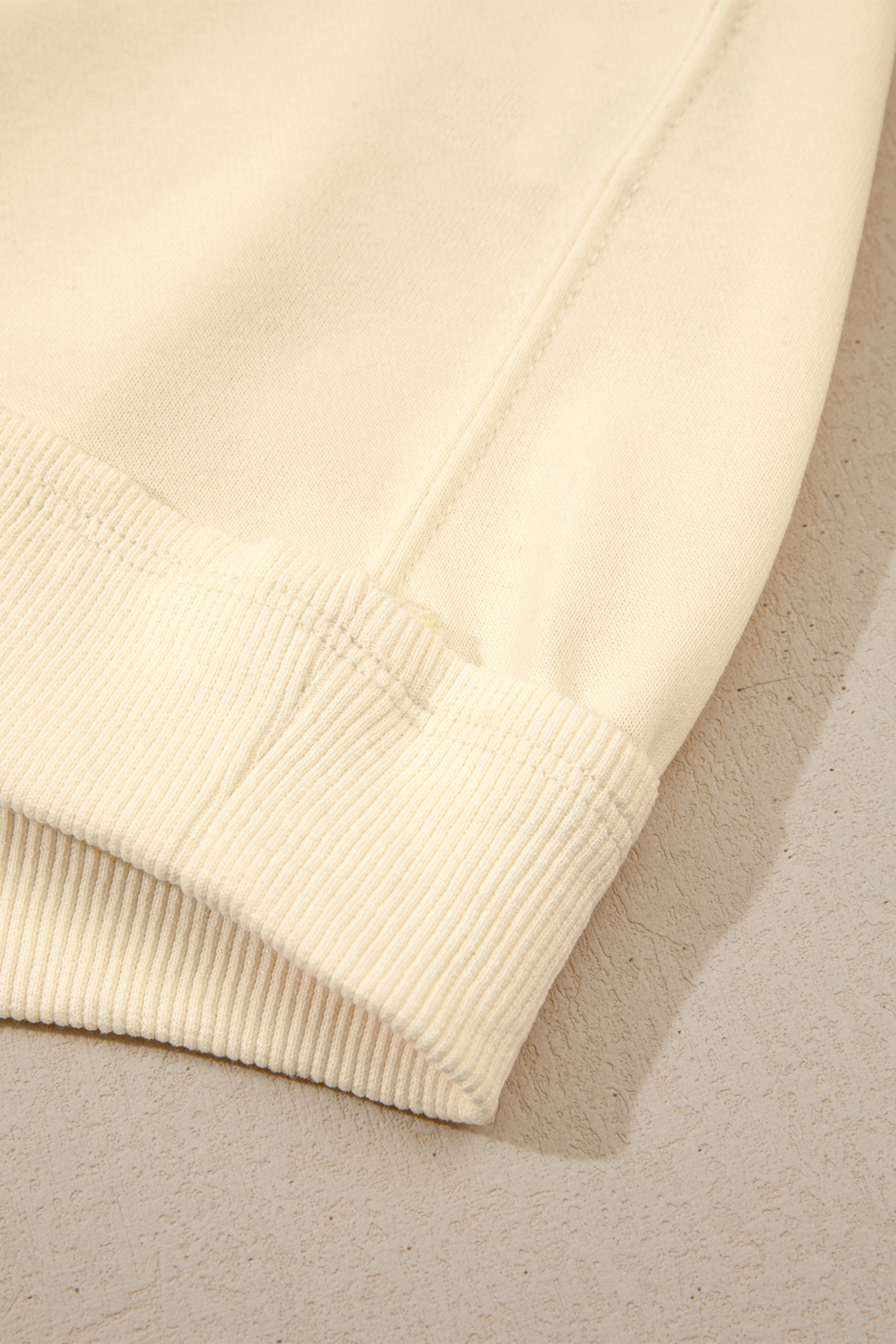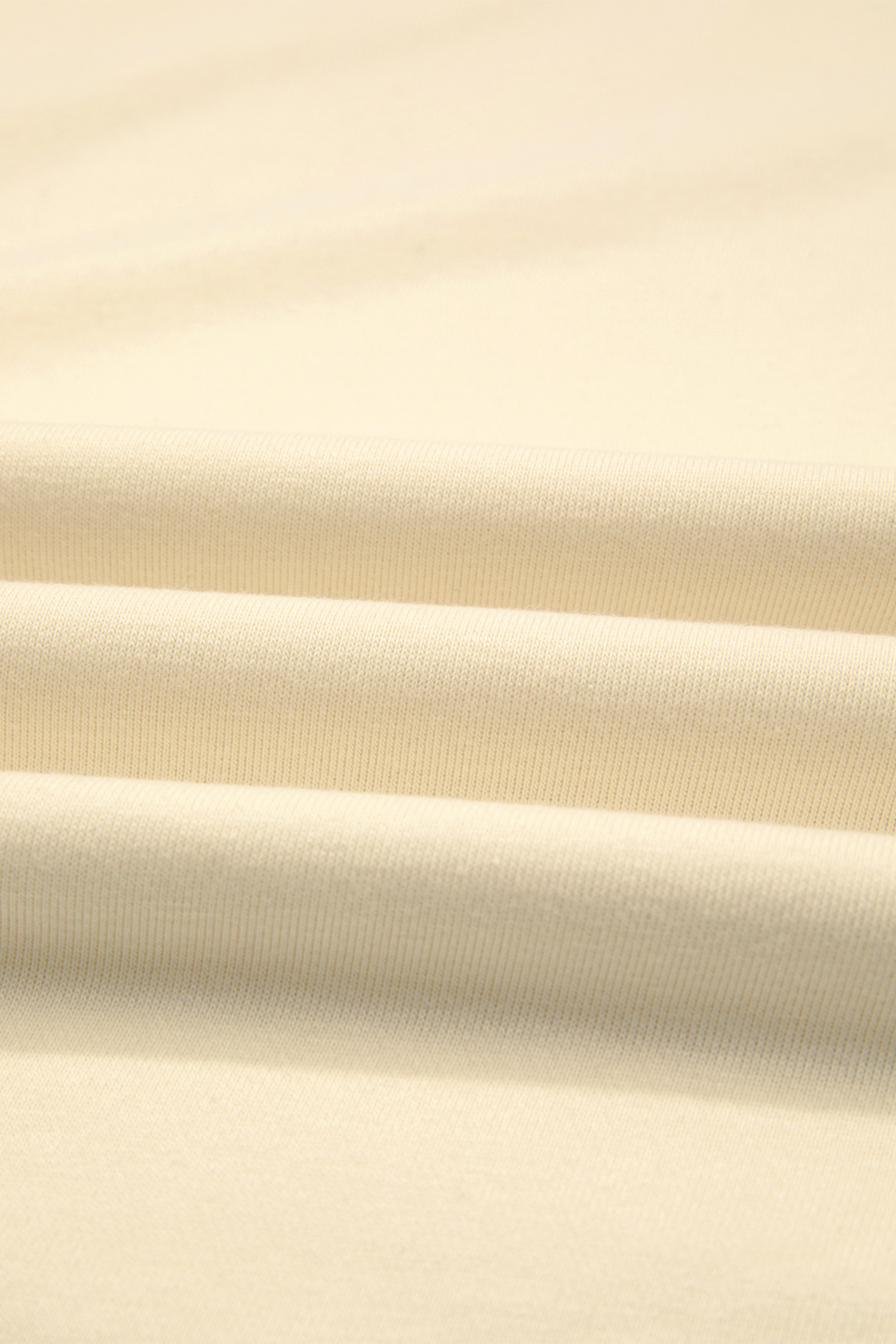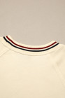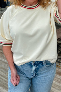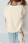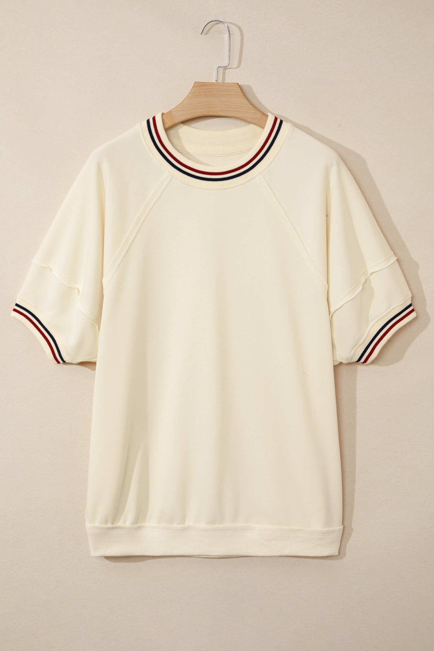 Tunique ample beige à rayures contrastées, col à revers et manches courtes.