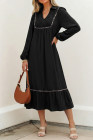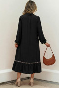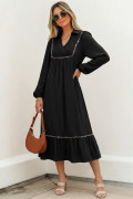 Robe longue noire à col en V et détails froncés, bordure léopard contrastée, manches bracelet