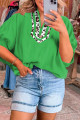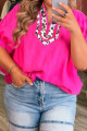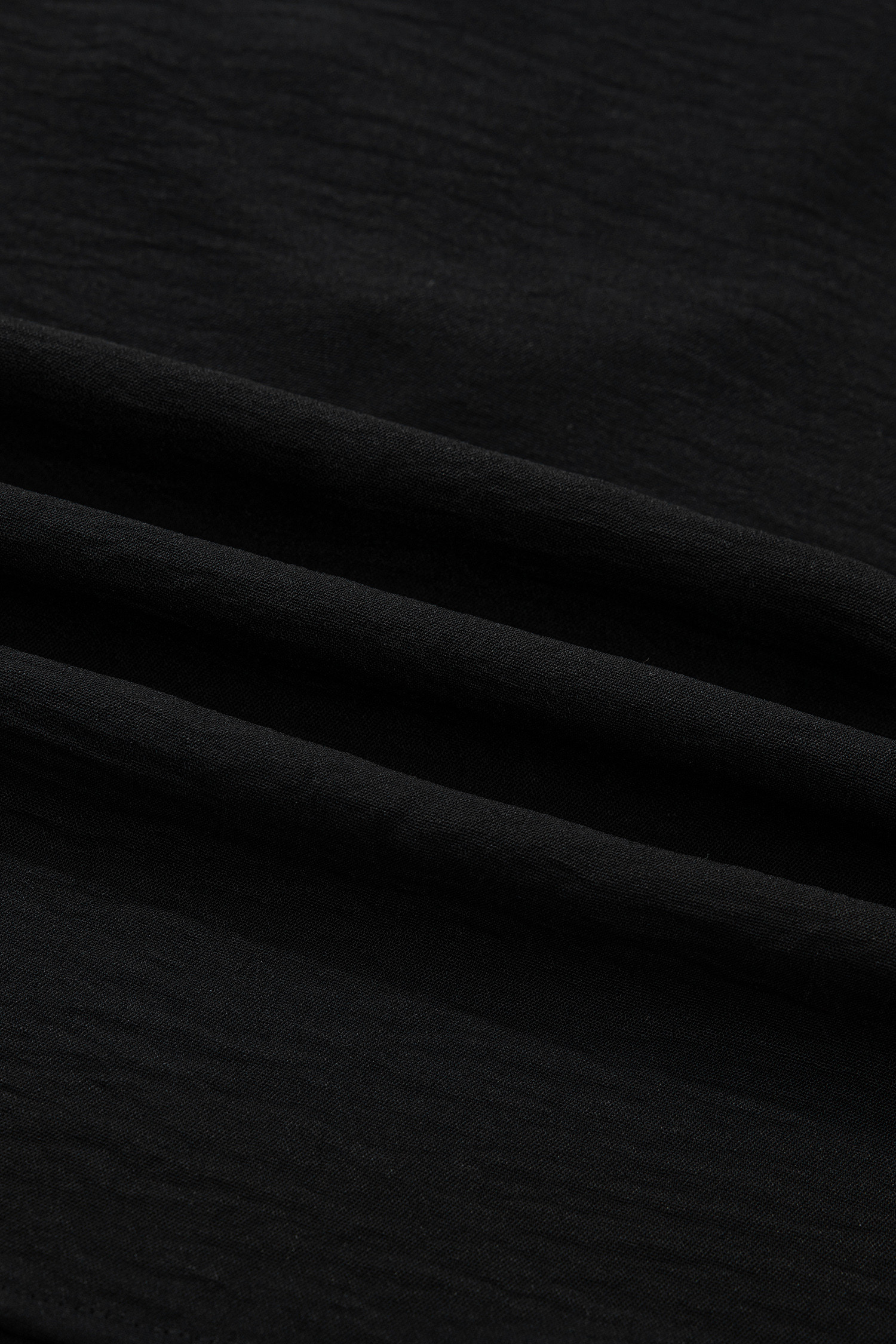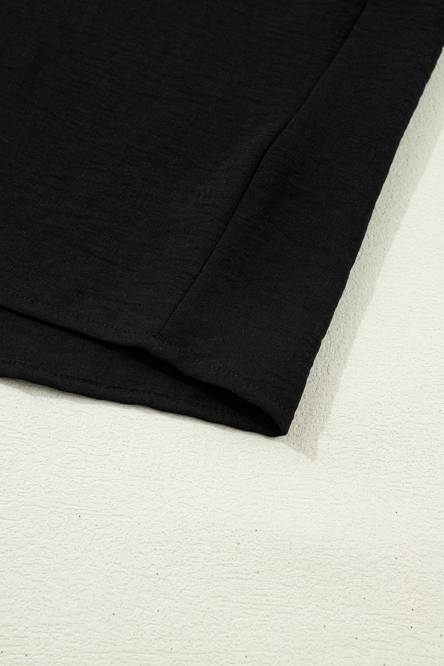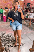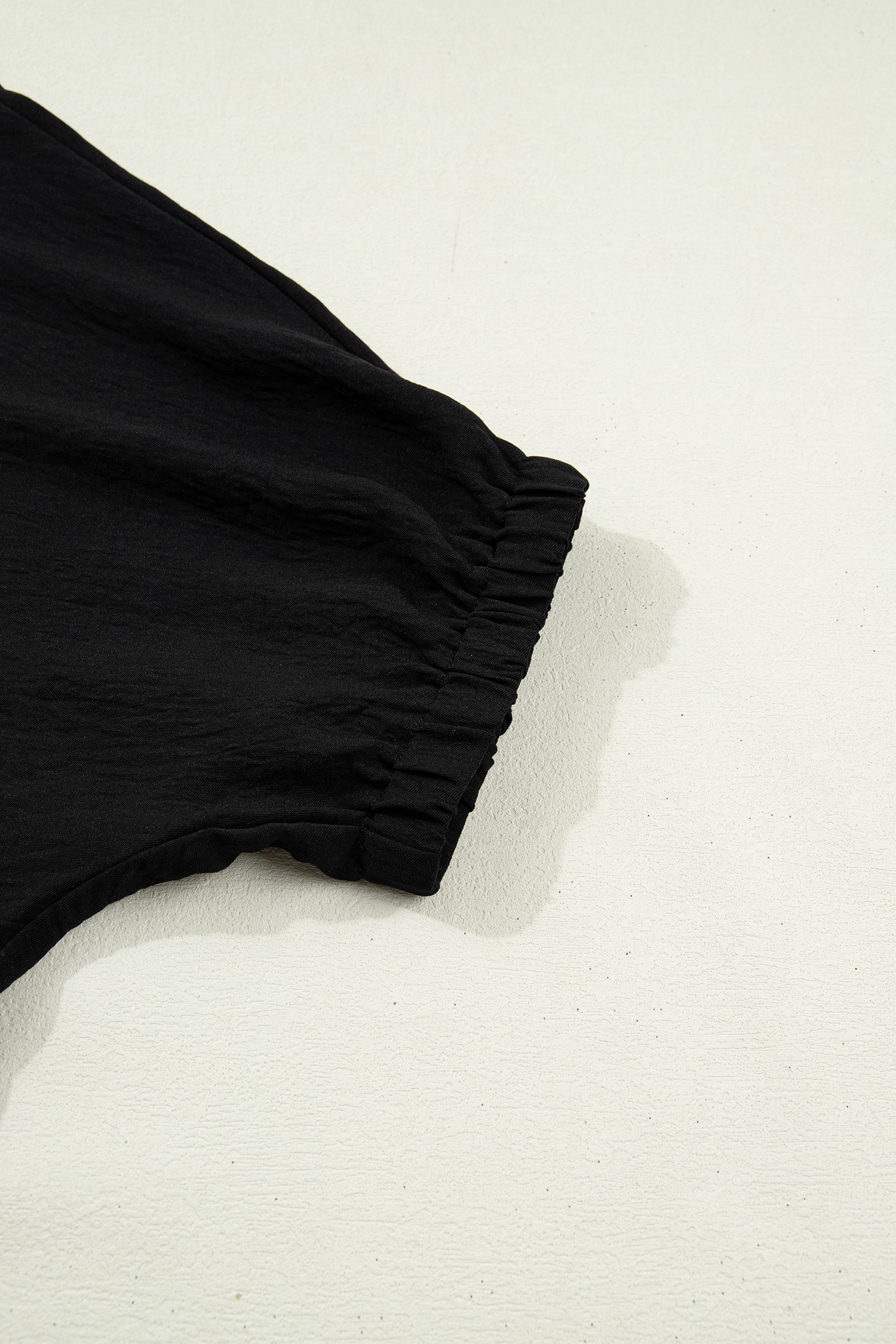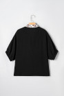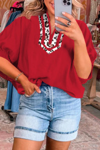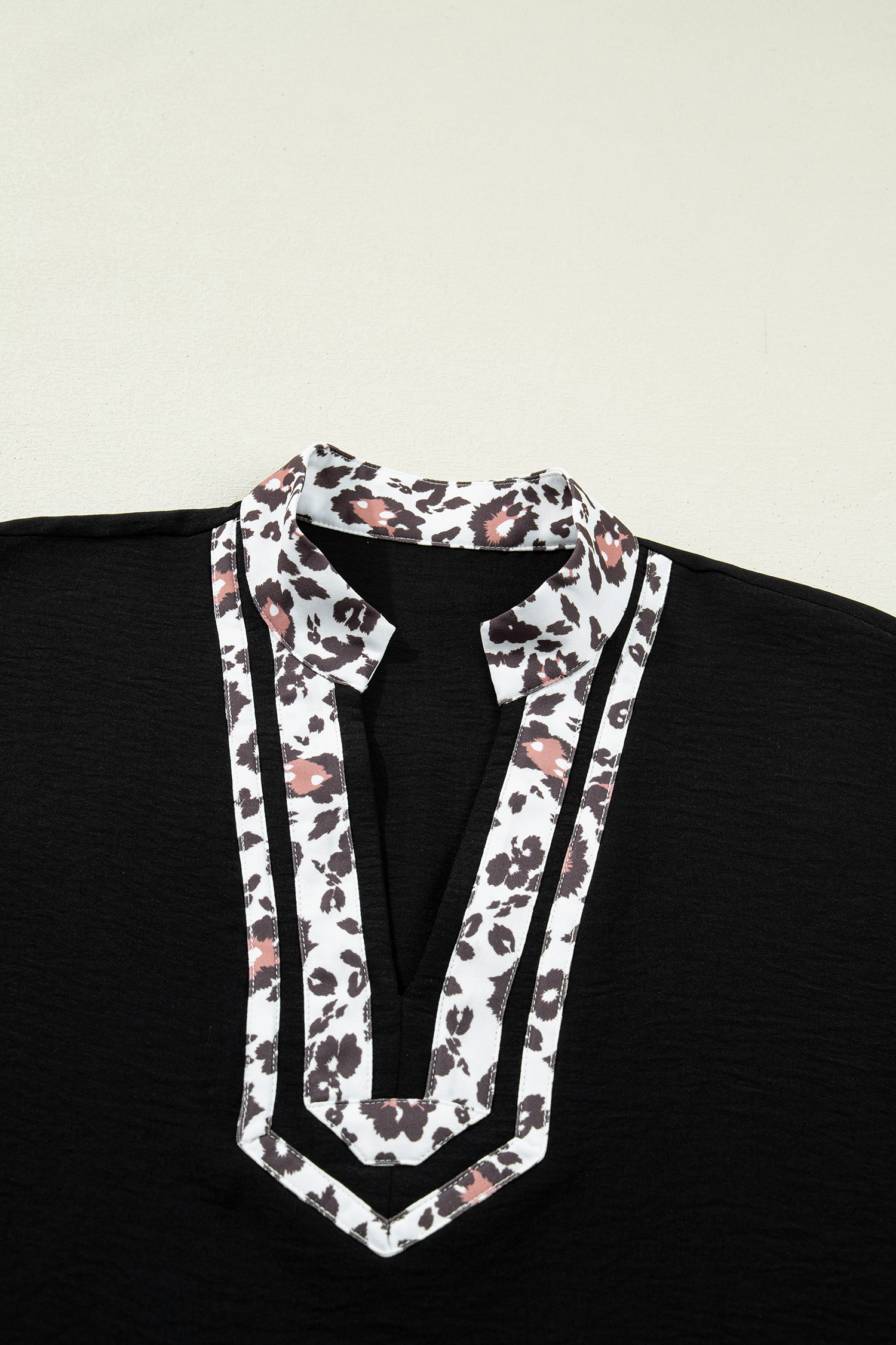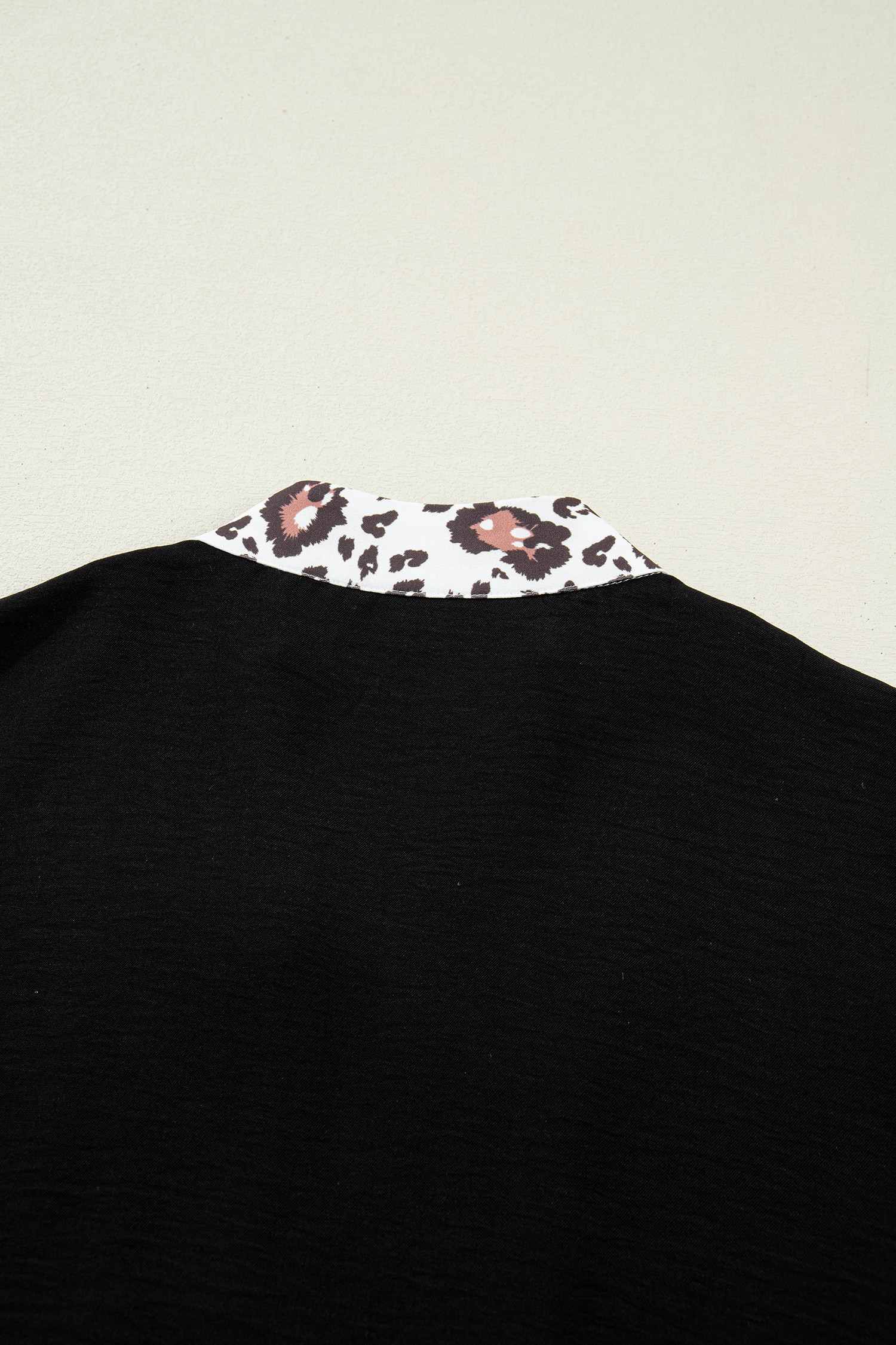 Chemisier noir à manches dolman et col en V, orné d'empiècements léopard et de détails léopard.