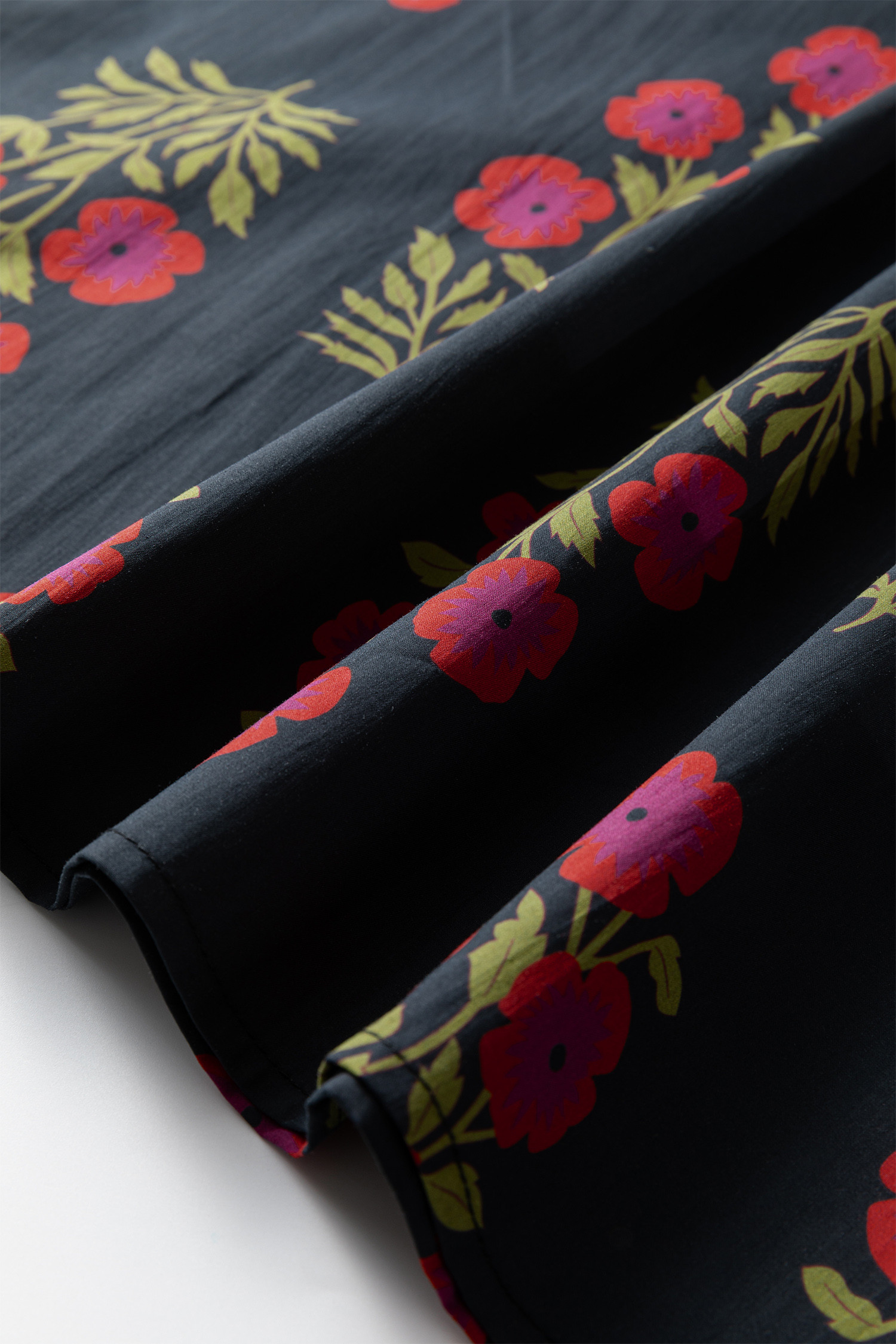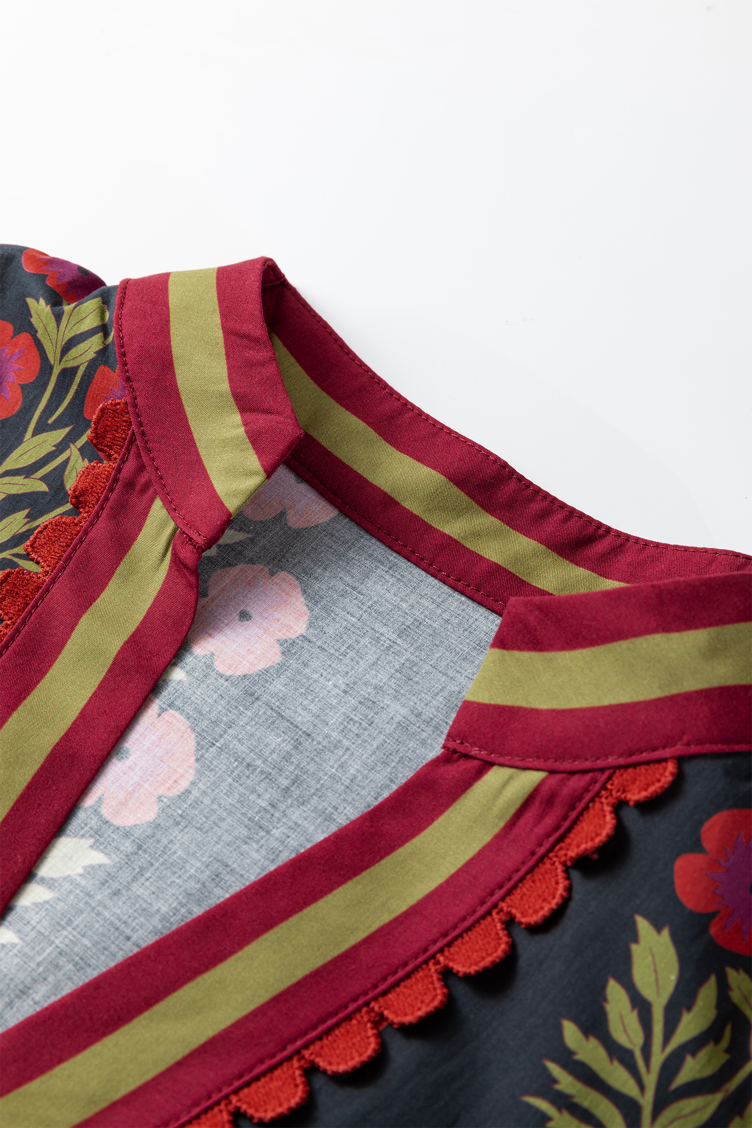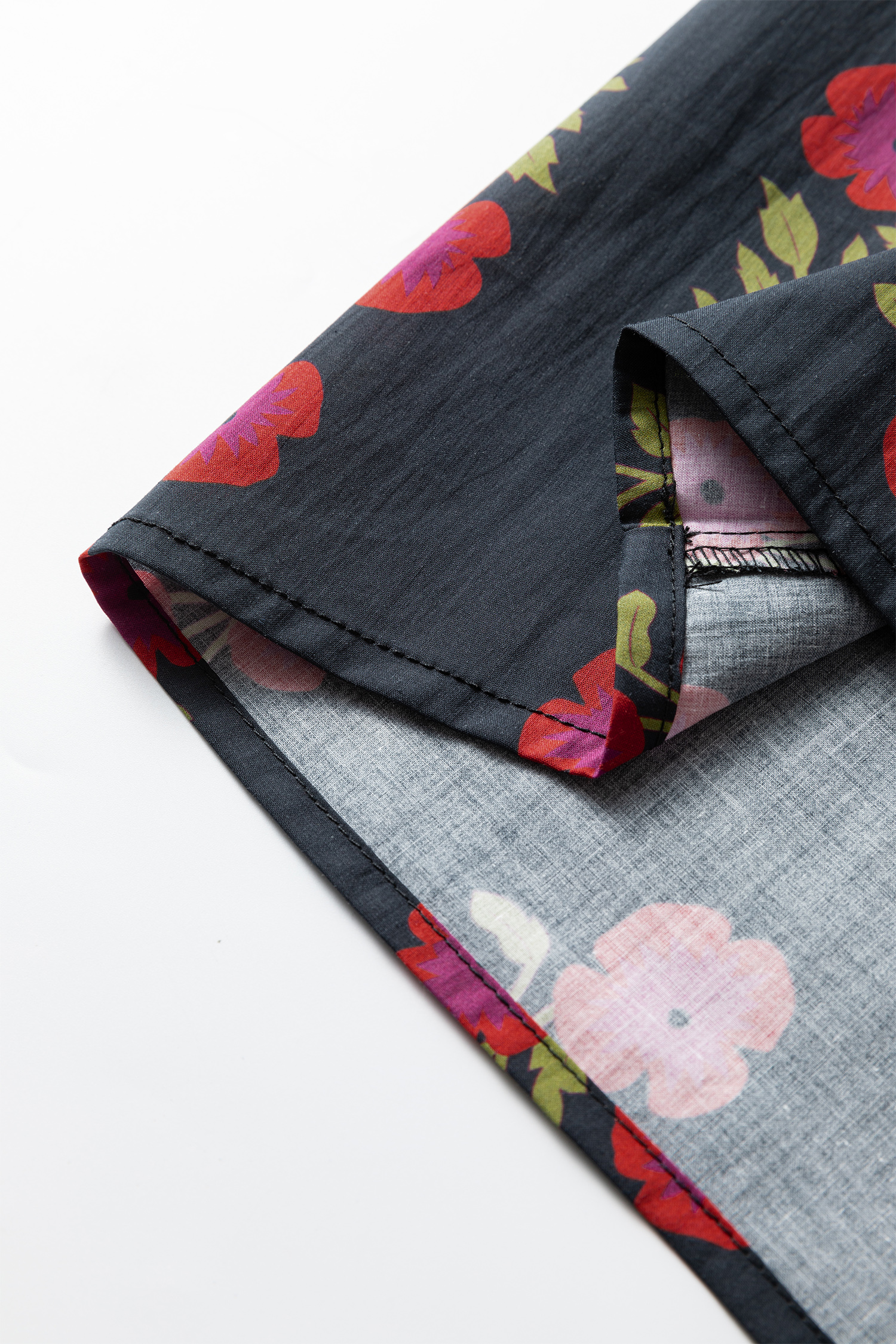 Chemisier noir à fleurs et manches courtes bouffantes avec encolure fendue contrastée