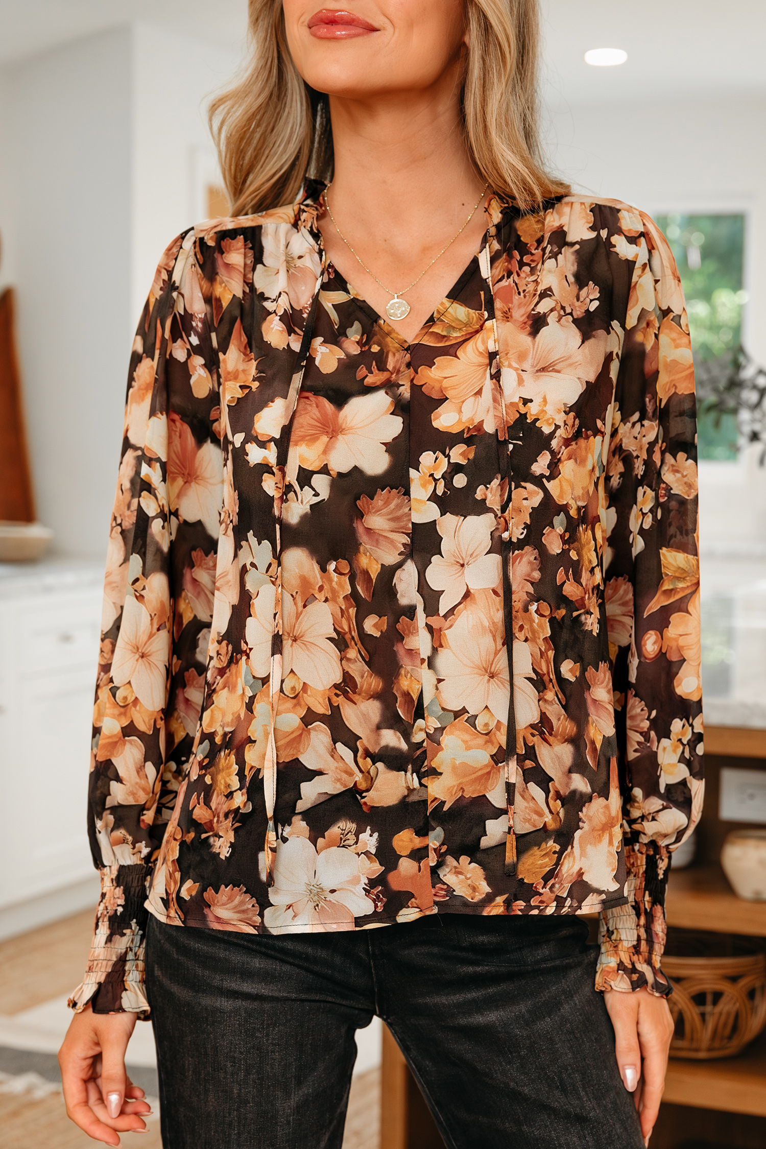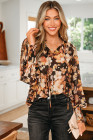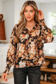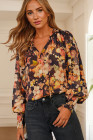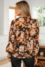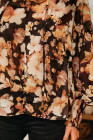 Chemisier noir à fleurs, col en V, manches longues bouffantes et aéré