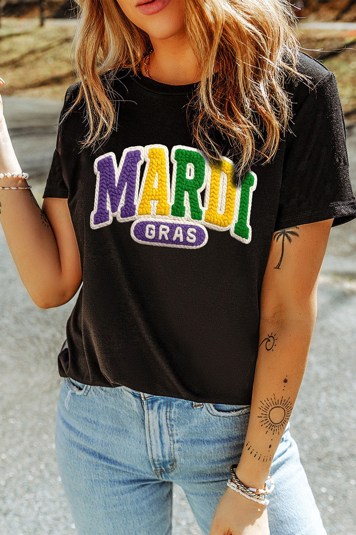 T-shirt noir MARDI GRAS avec motif de lettres en imitation fil