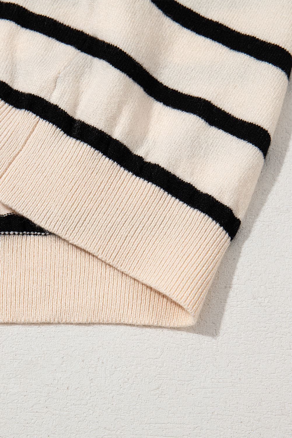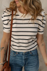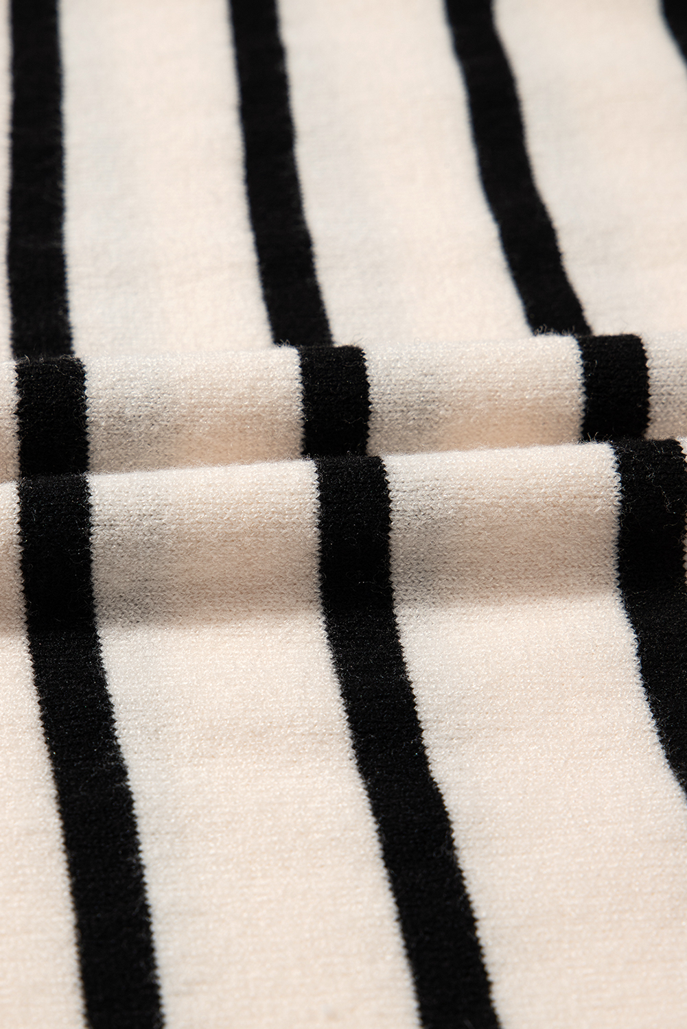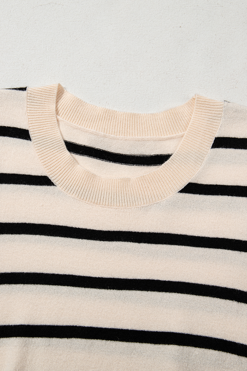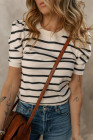 Haut tricoté à rayures noires, bordure côtelée, col rond, manches bouffantes