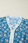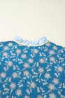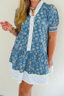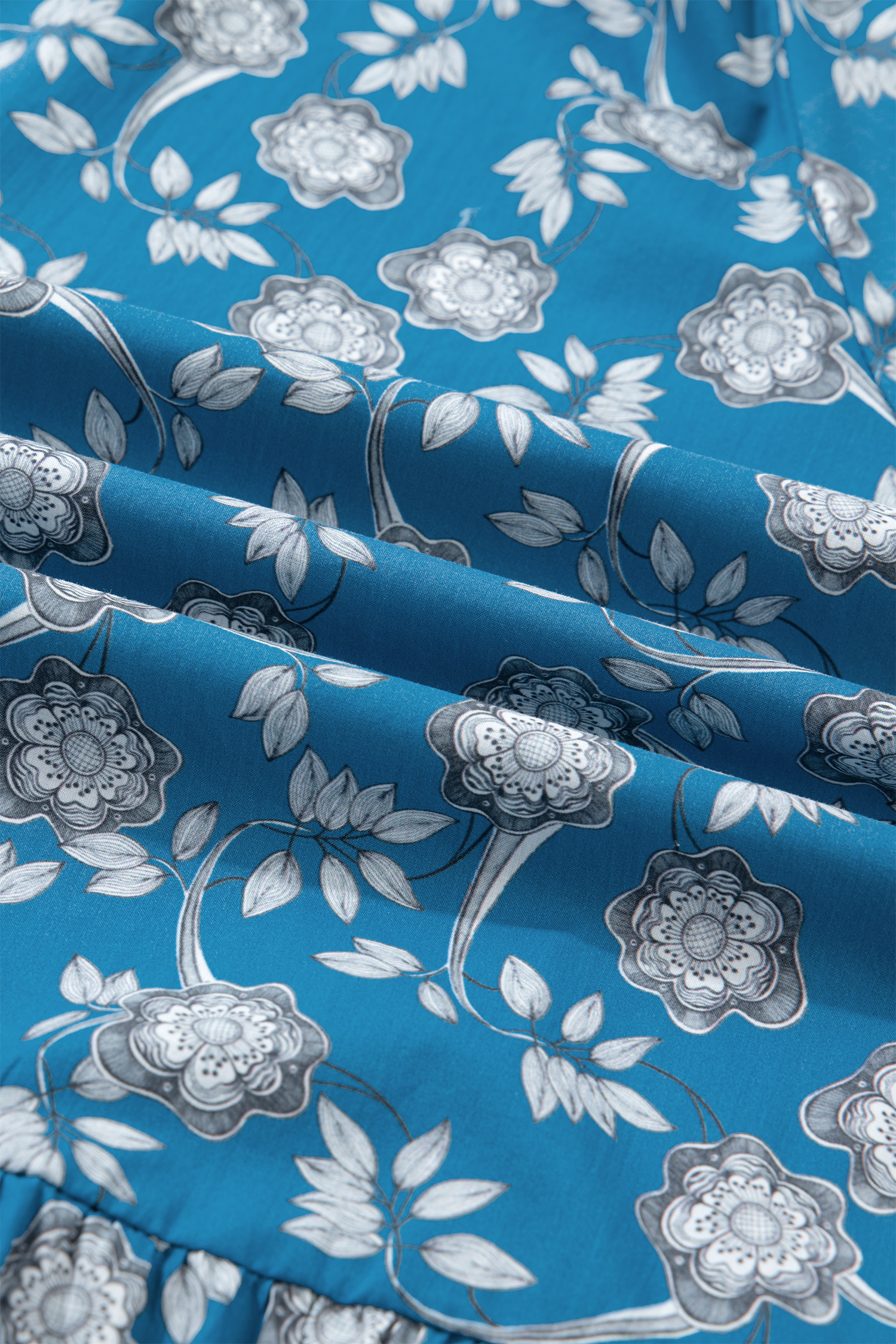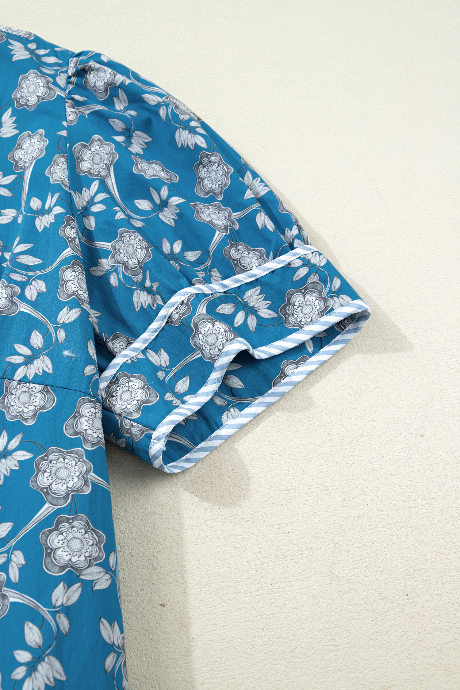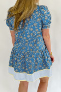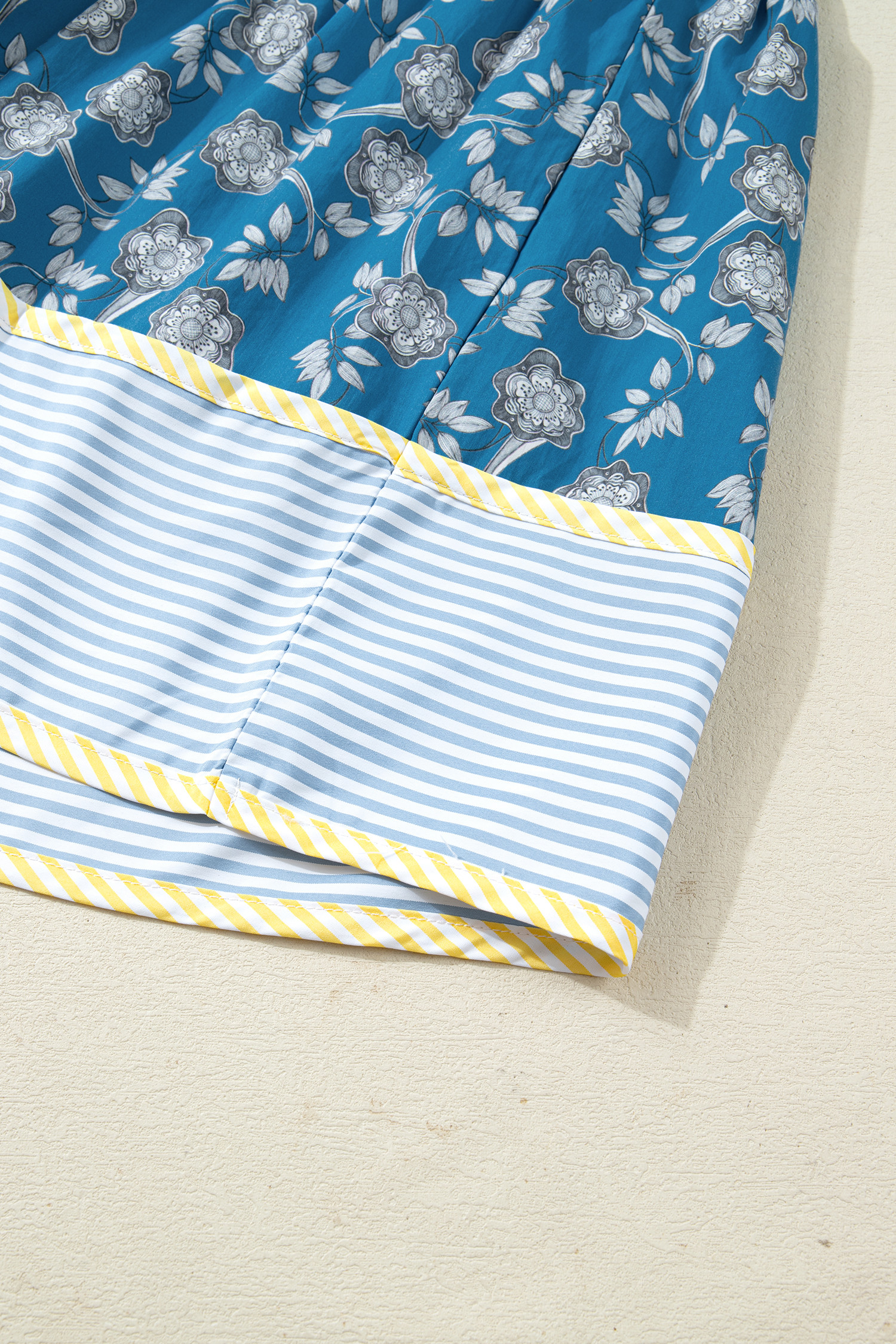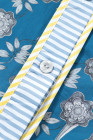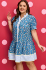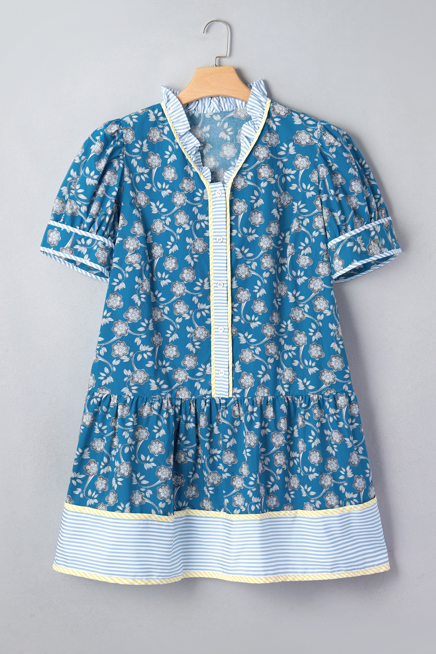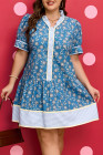 Robe bleue grande taille à imprimé floral, rayures et détails patchwork, boutonnée sur le devant et ourlet à volants