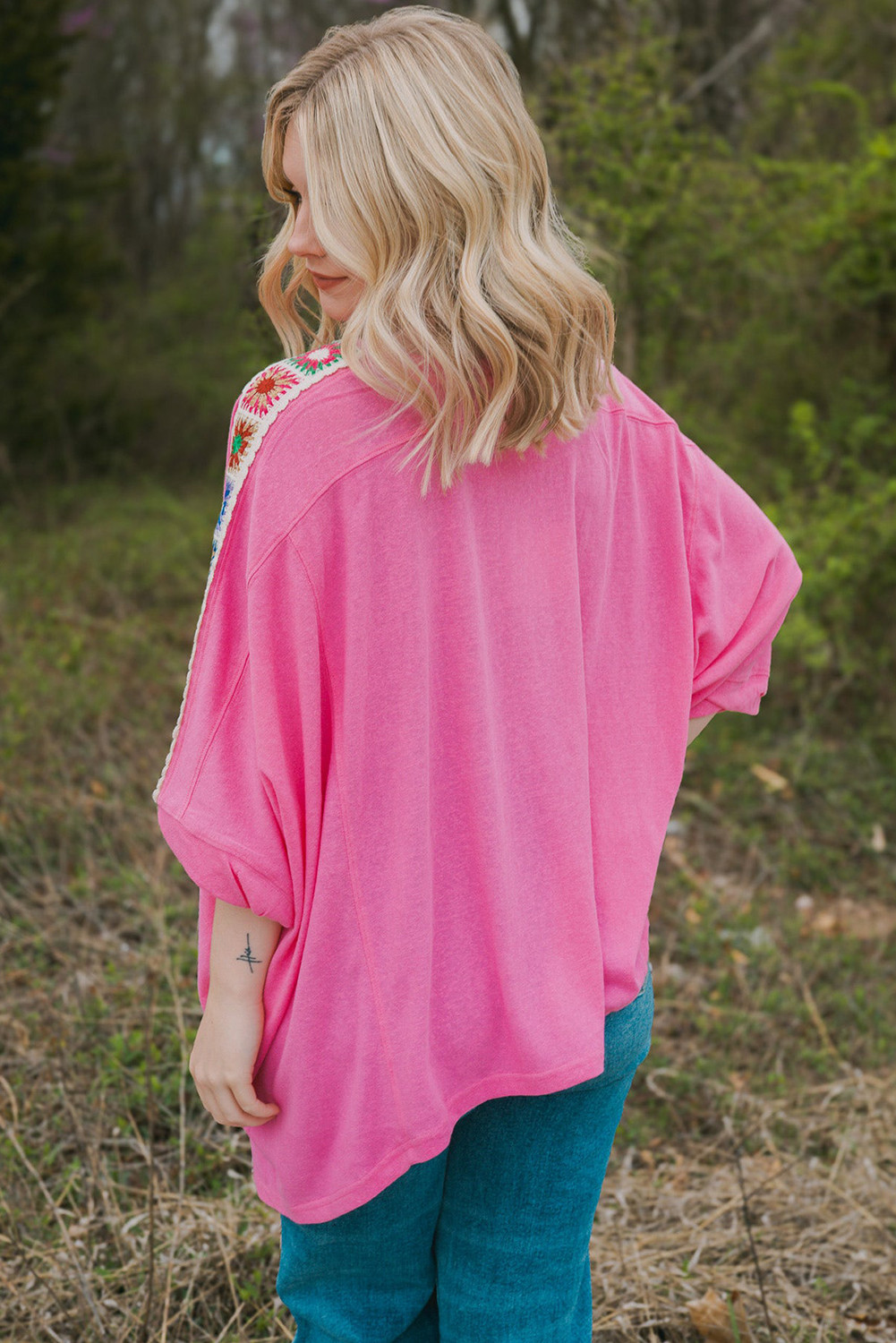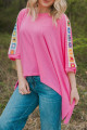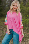 Chemisier tunique rose vif à manches mi-longues et empiècements en crochet