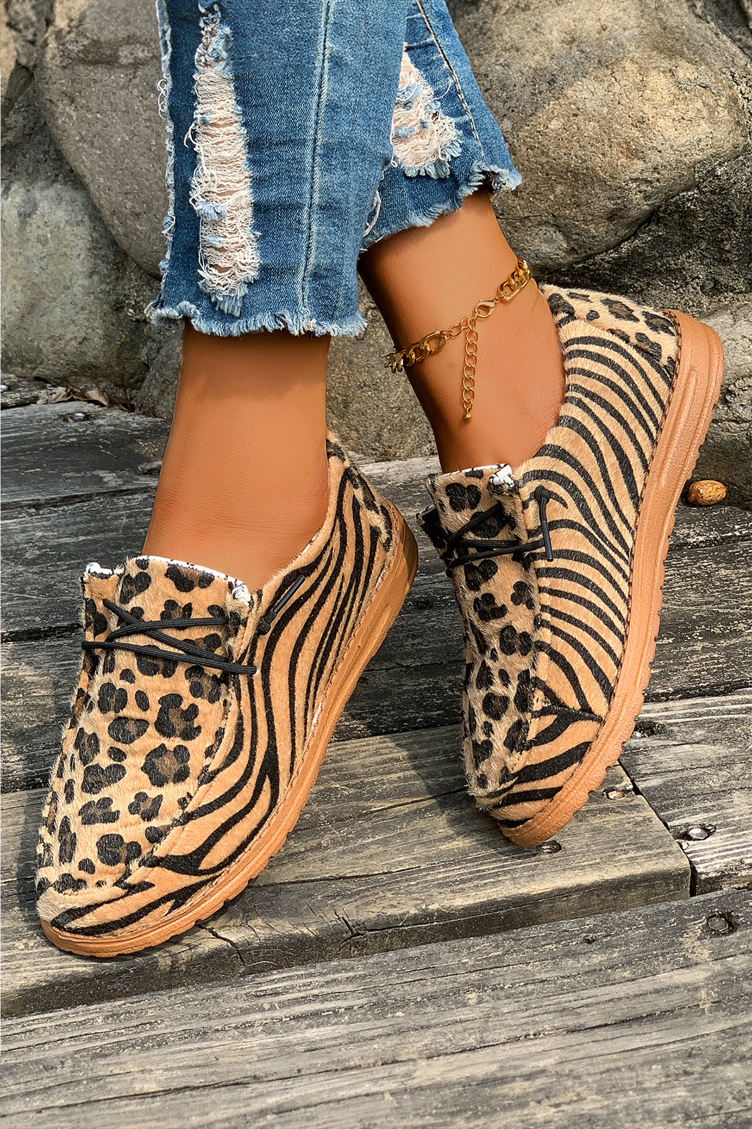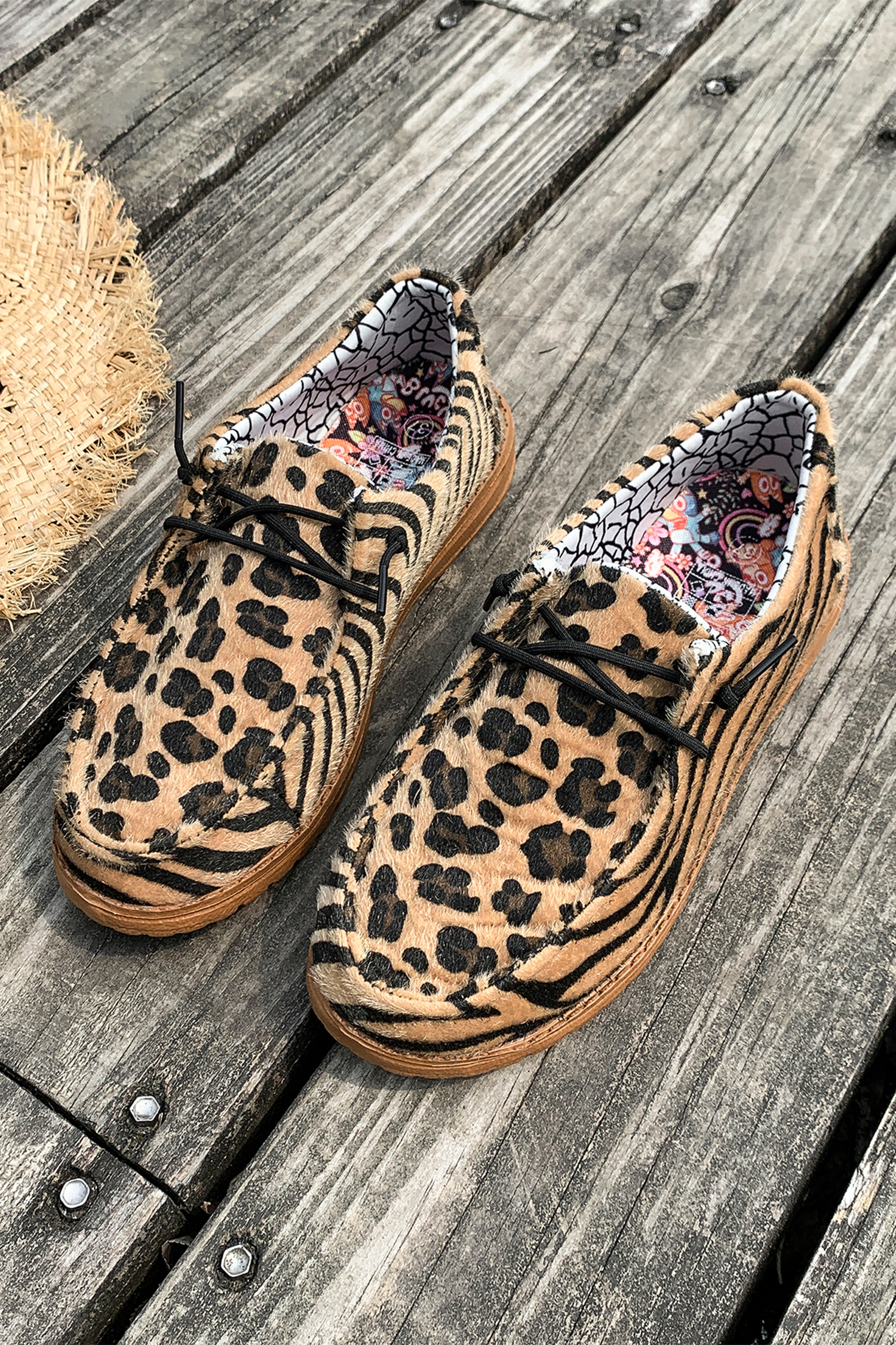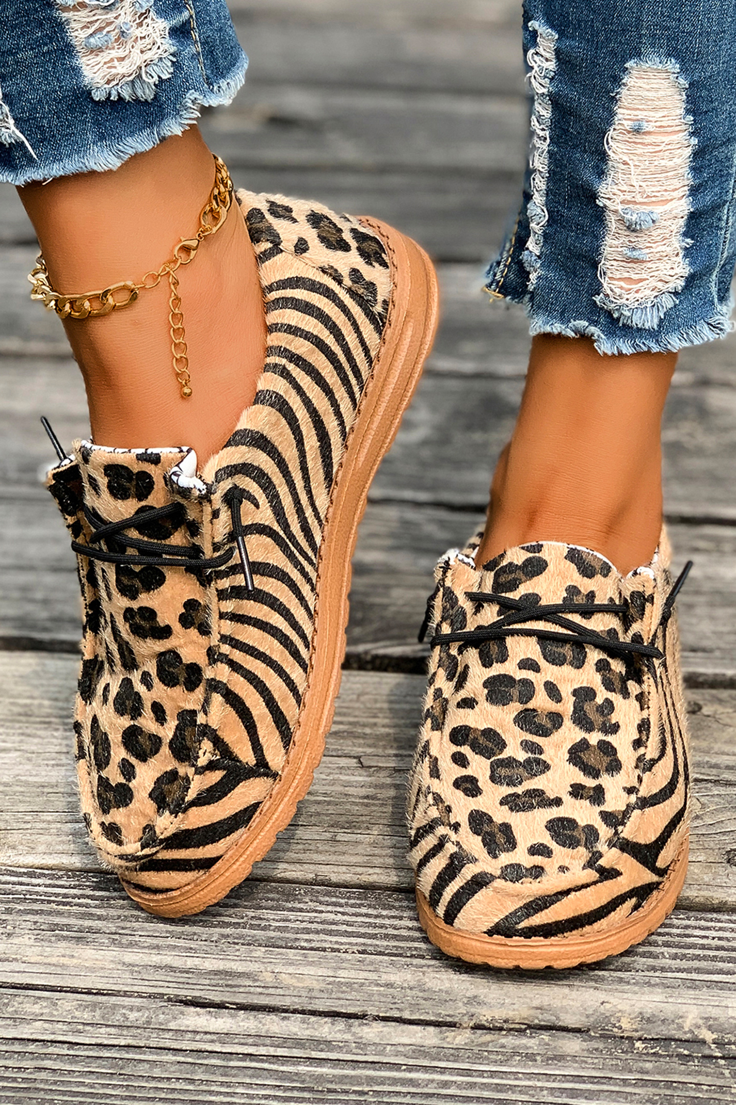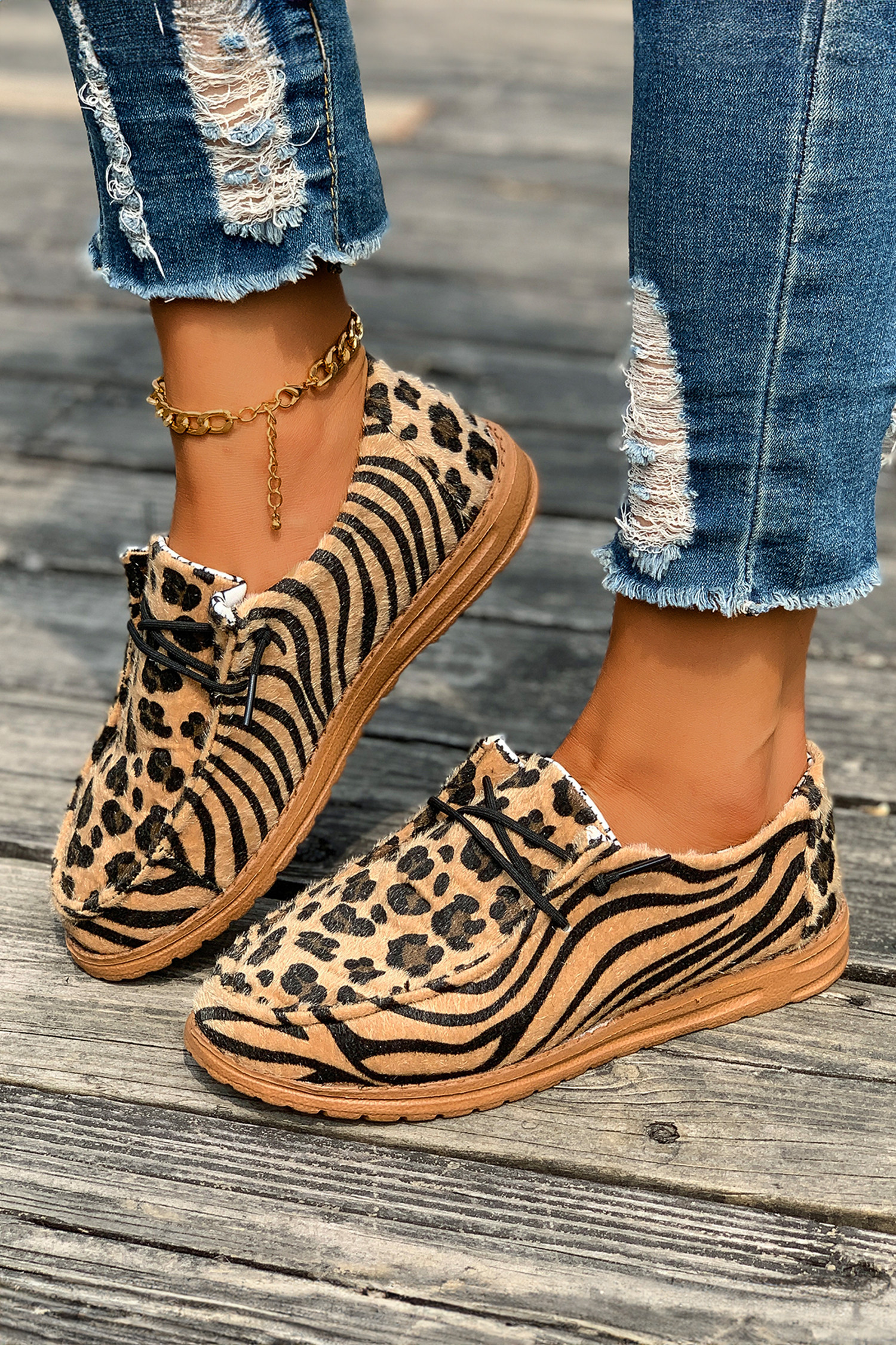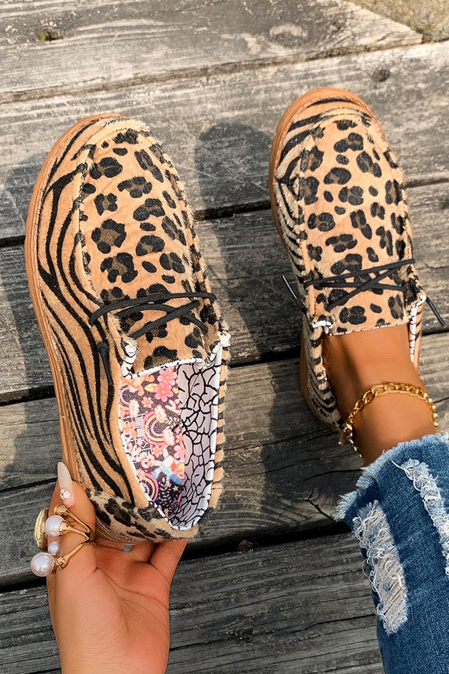 Chaussures marron en faux daim à empiècements léopard et tigre, lacées