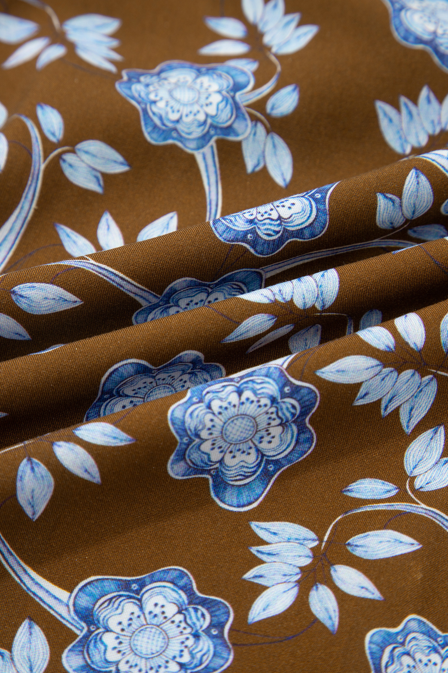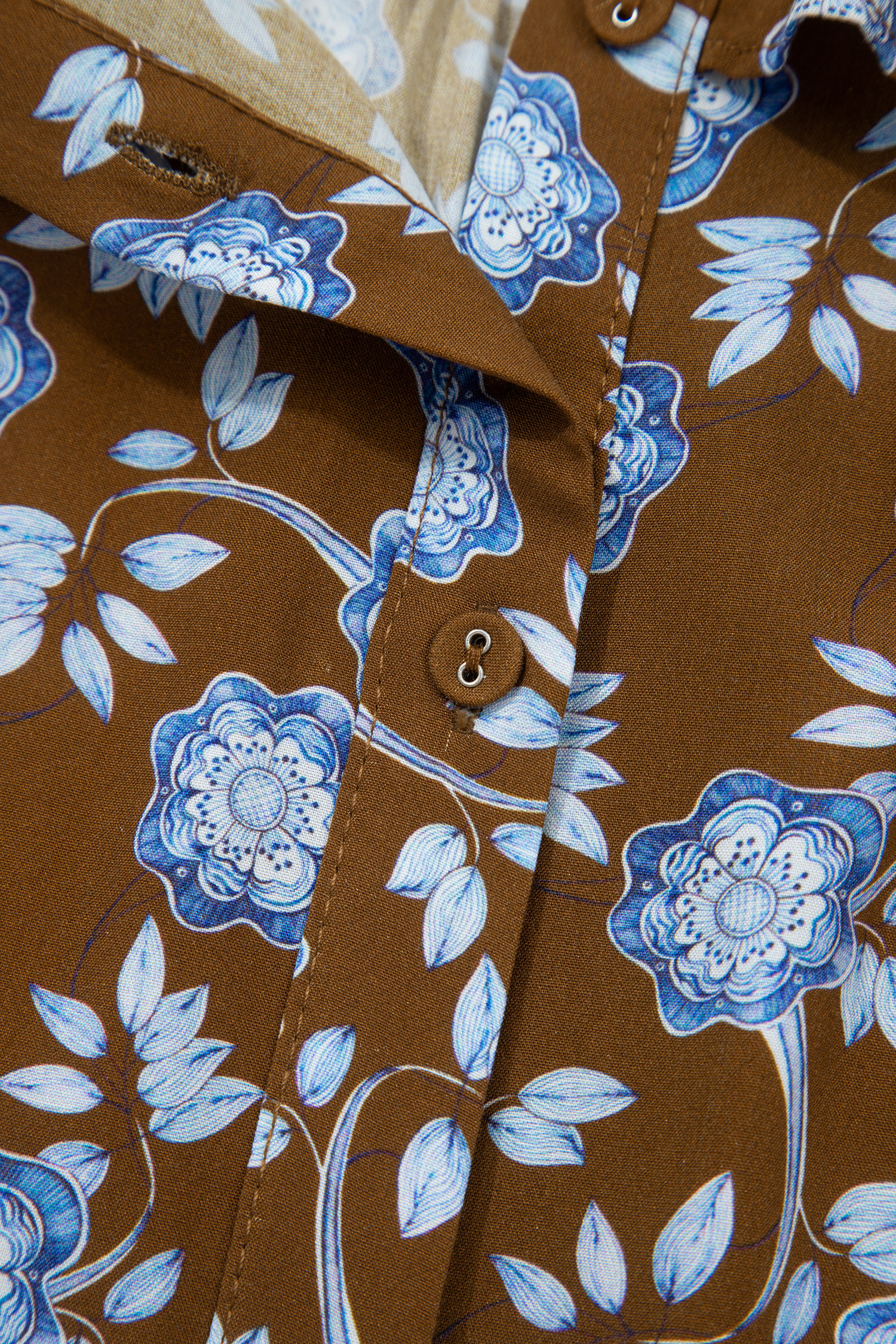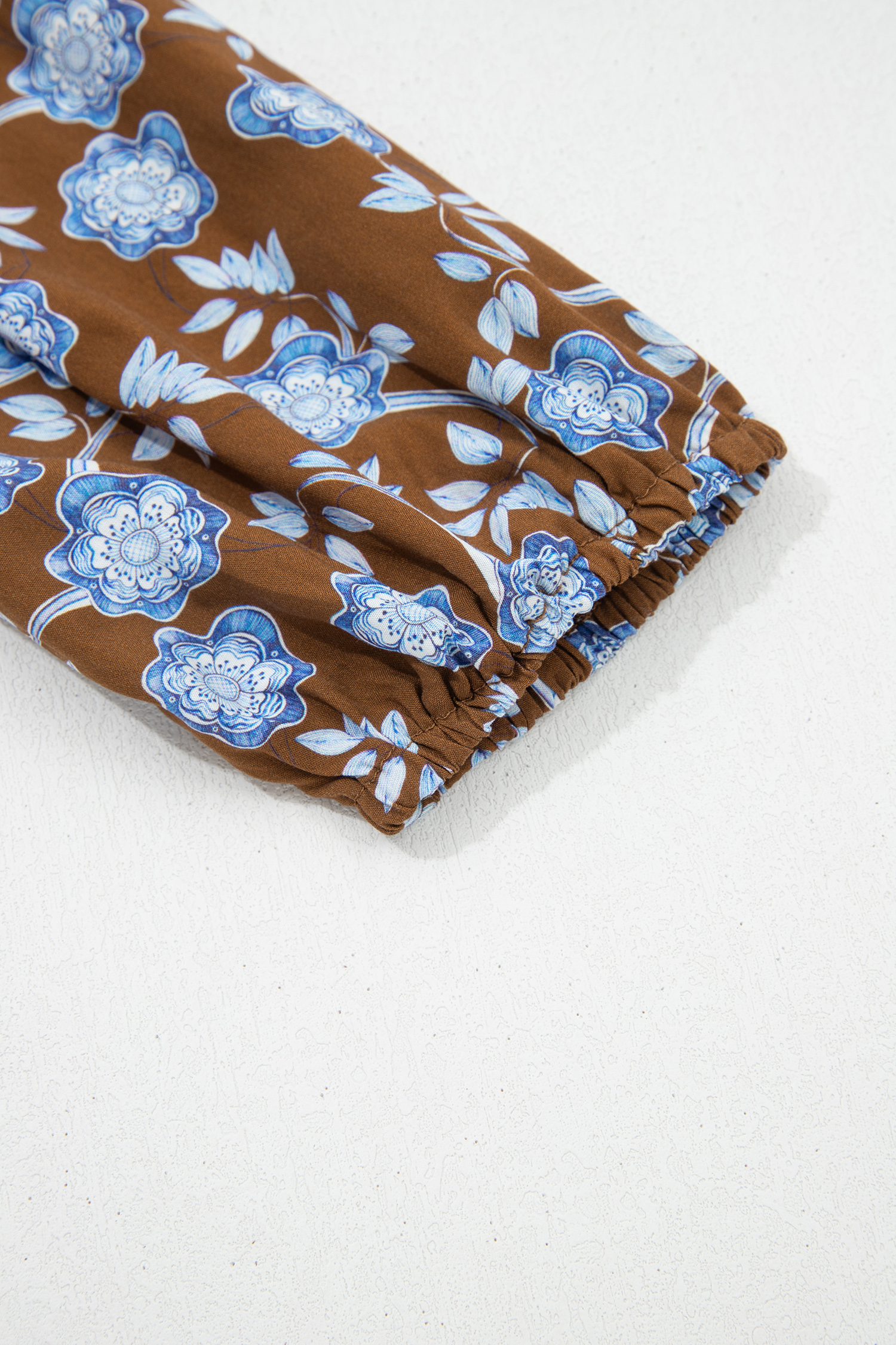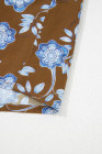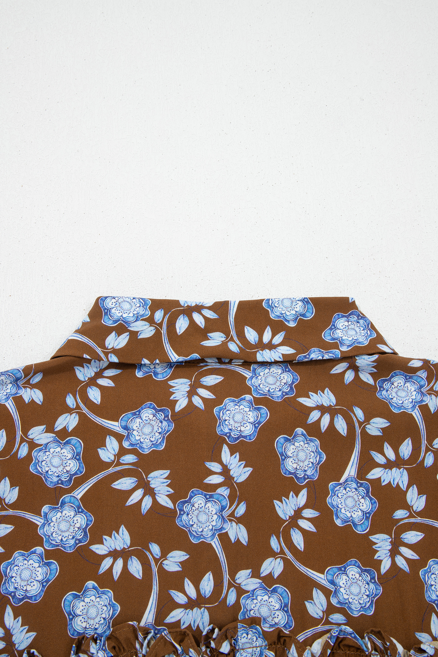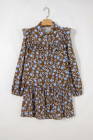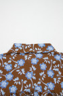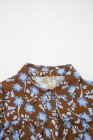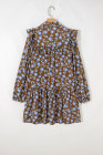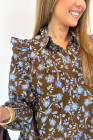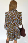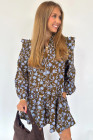 Robe chemise à imprimé floral marron, détails volantés, col boutonné, manches longues