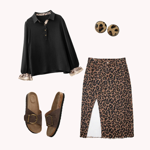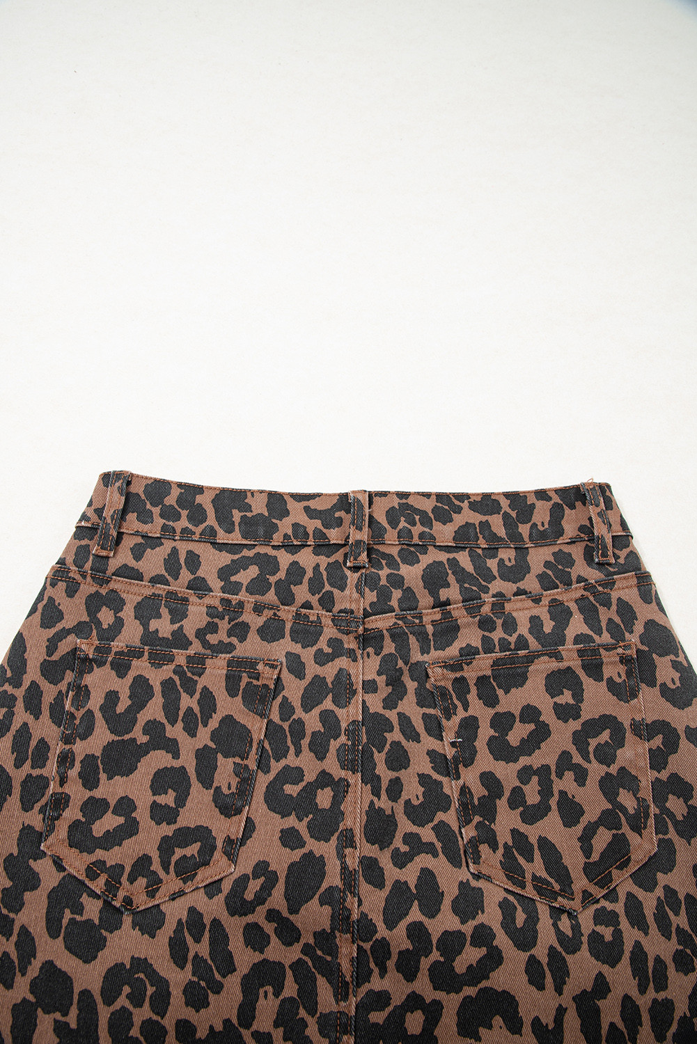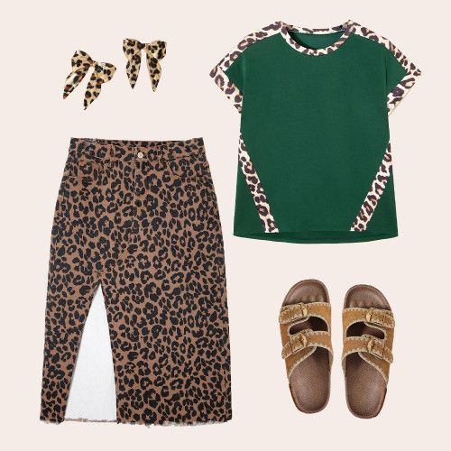 Jupe midi fendue en denim effiloché à motif léopard marron