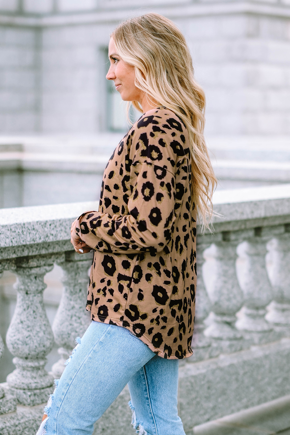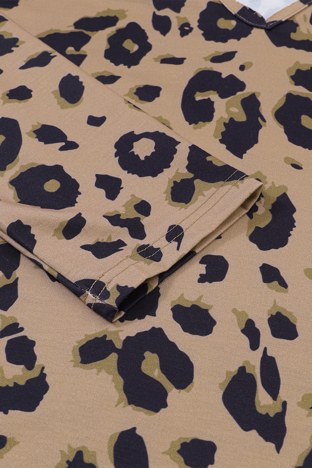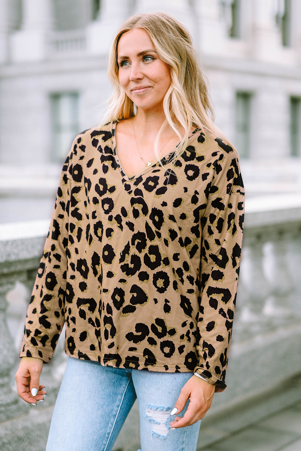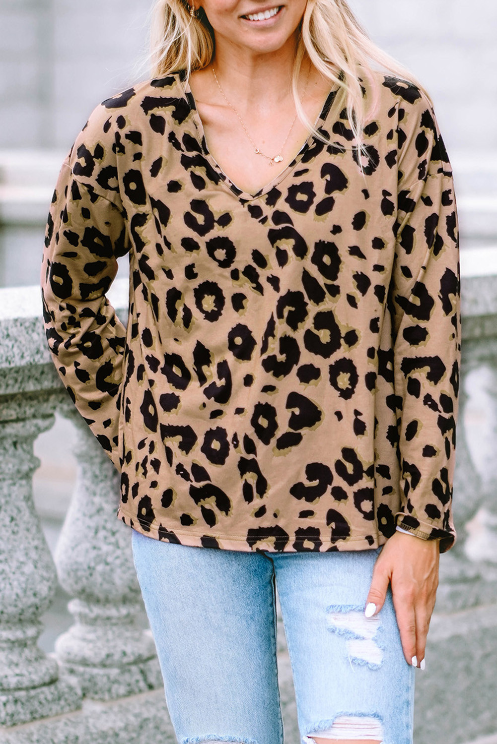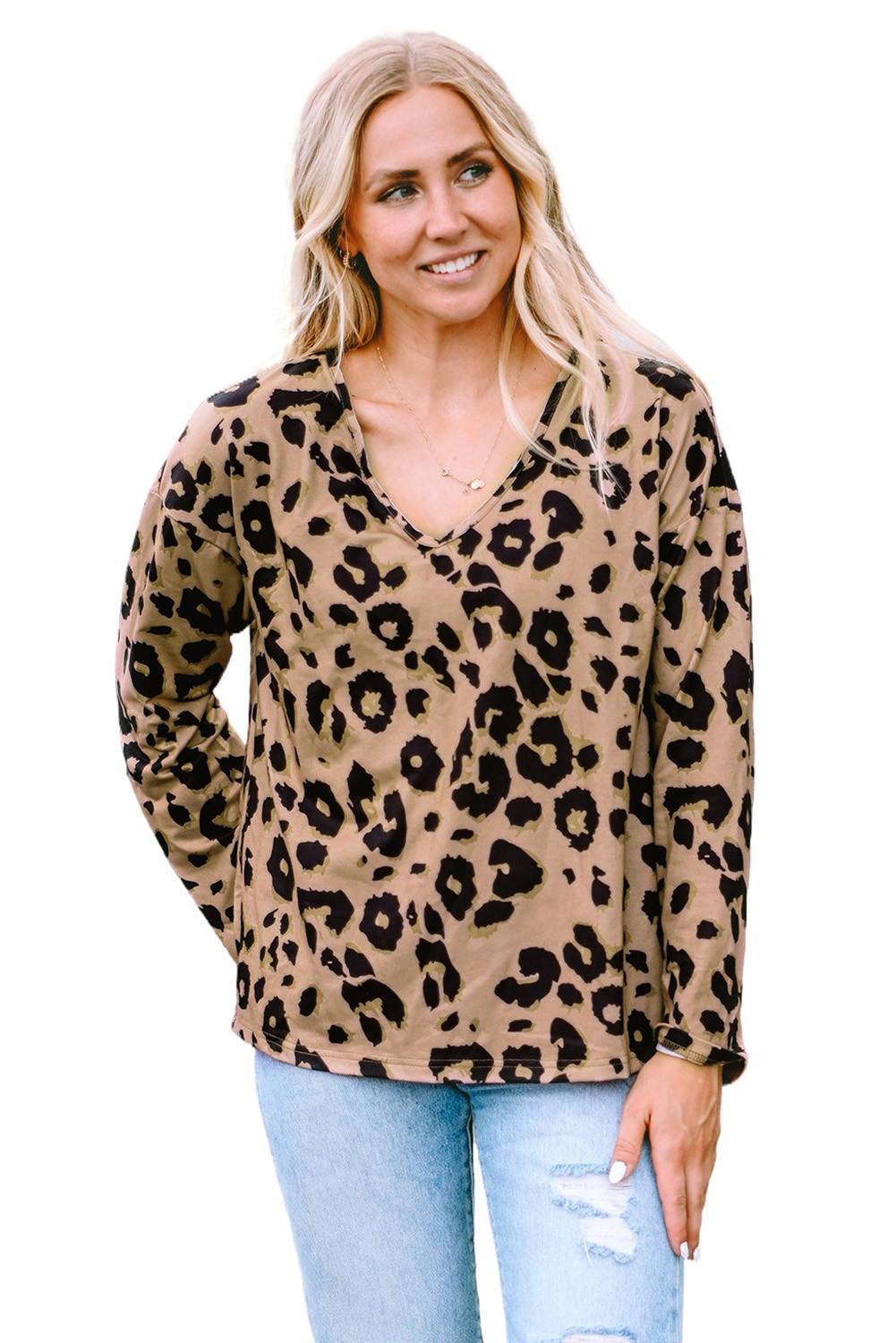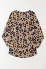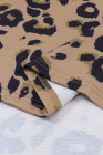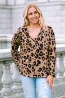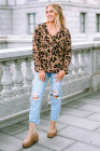 Tops à manches longues et col en V marron à imprimé léopard