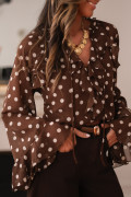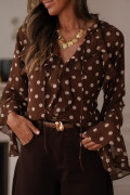 Chemisier à pois café, col V à volants et manches longues cloche, orné de volants.