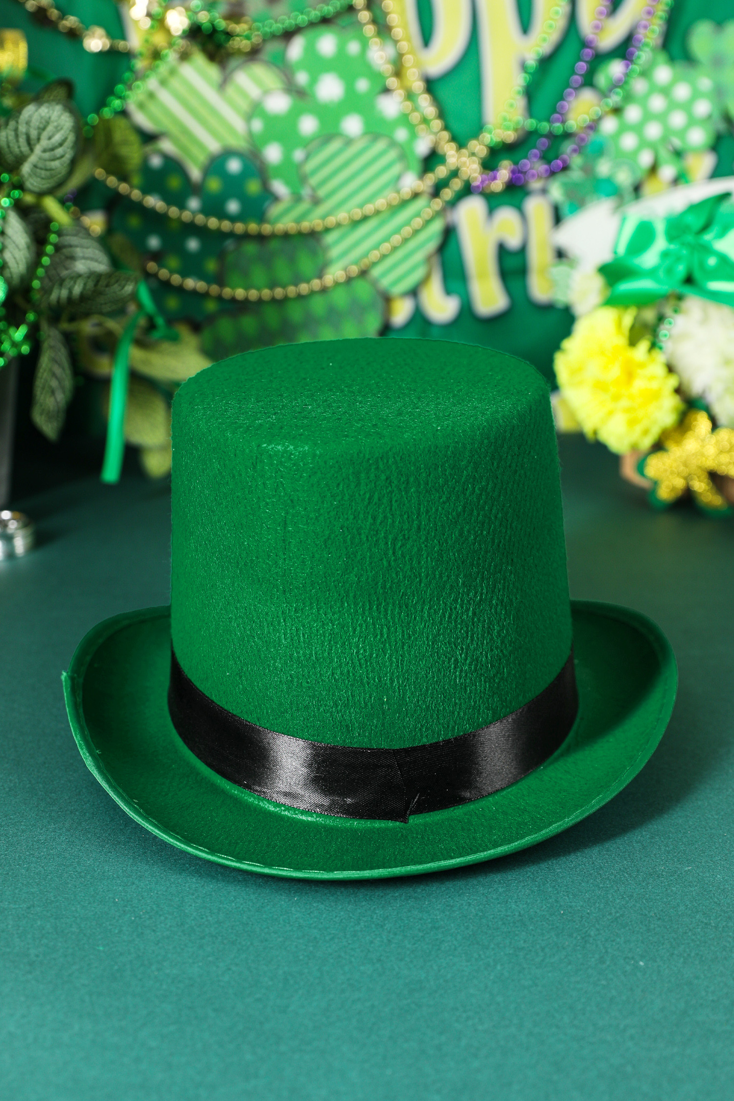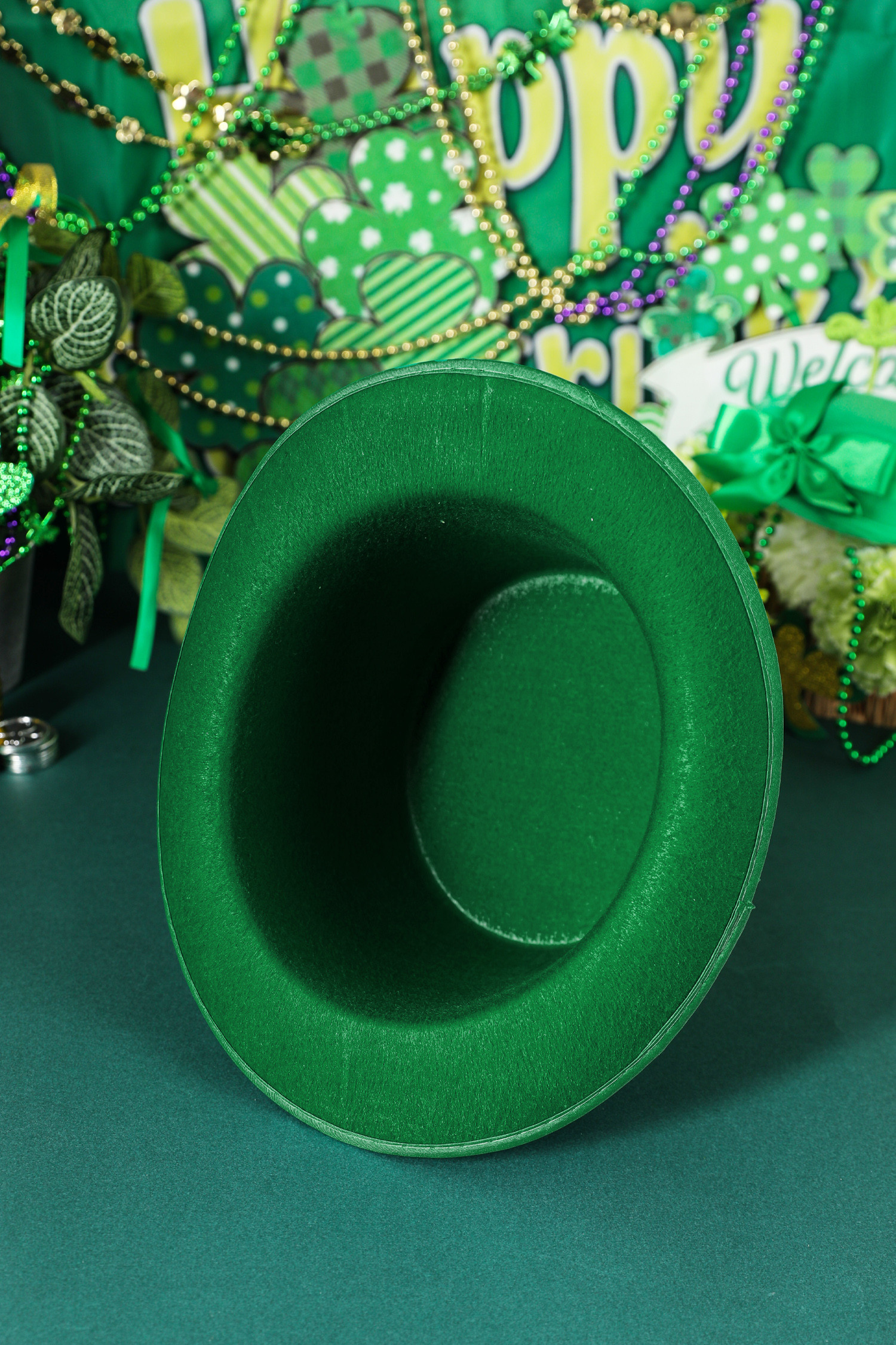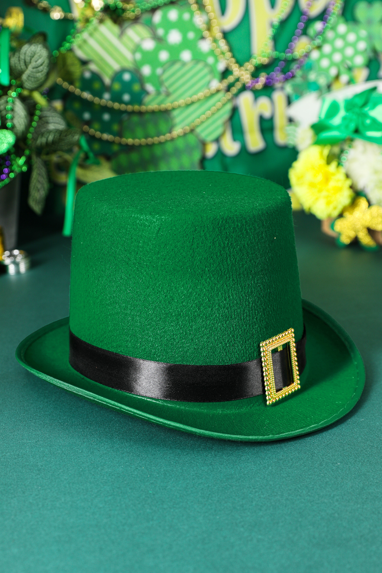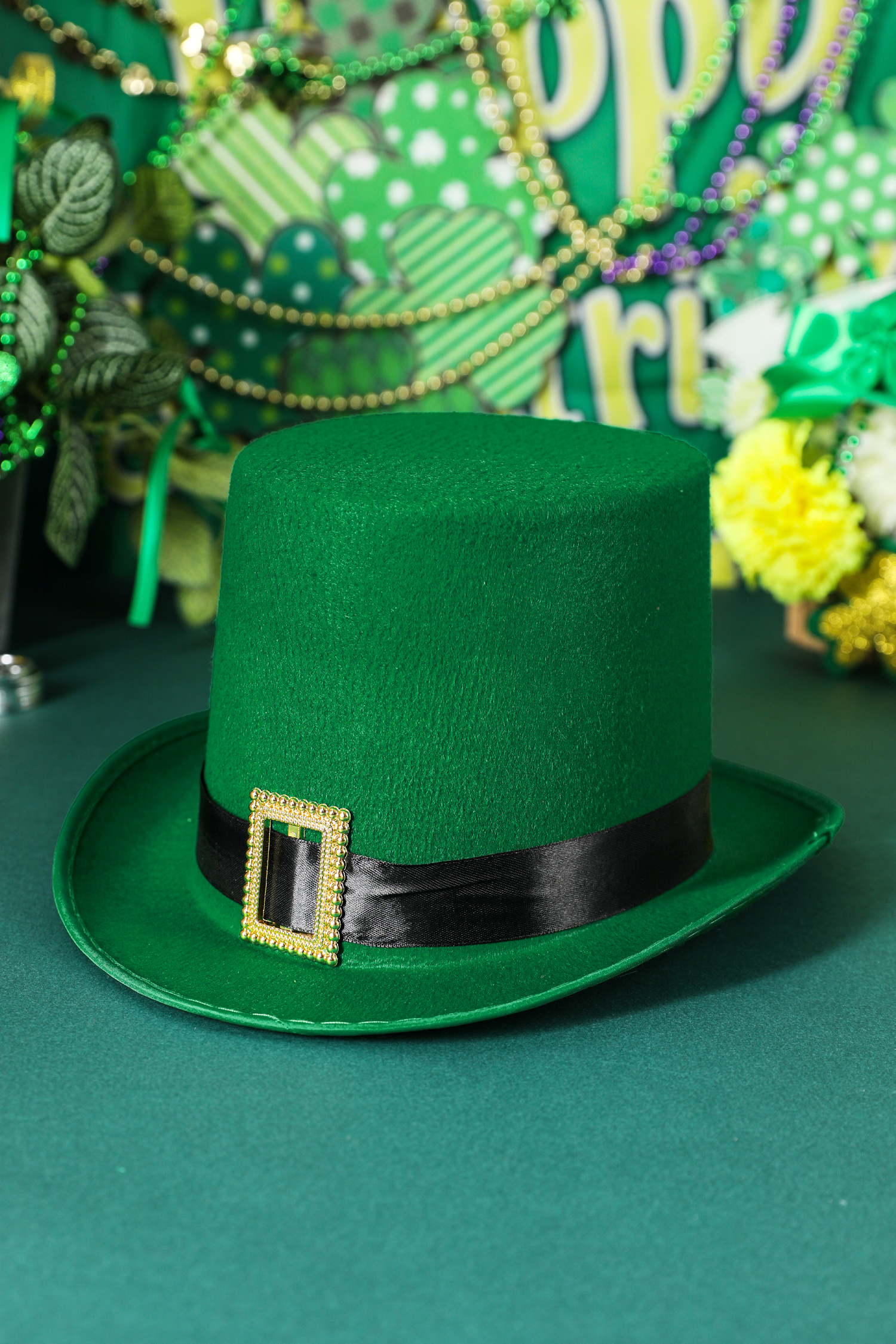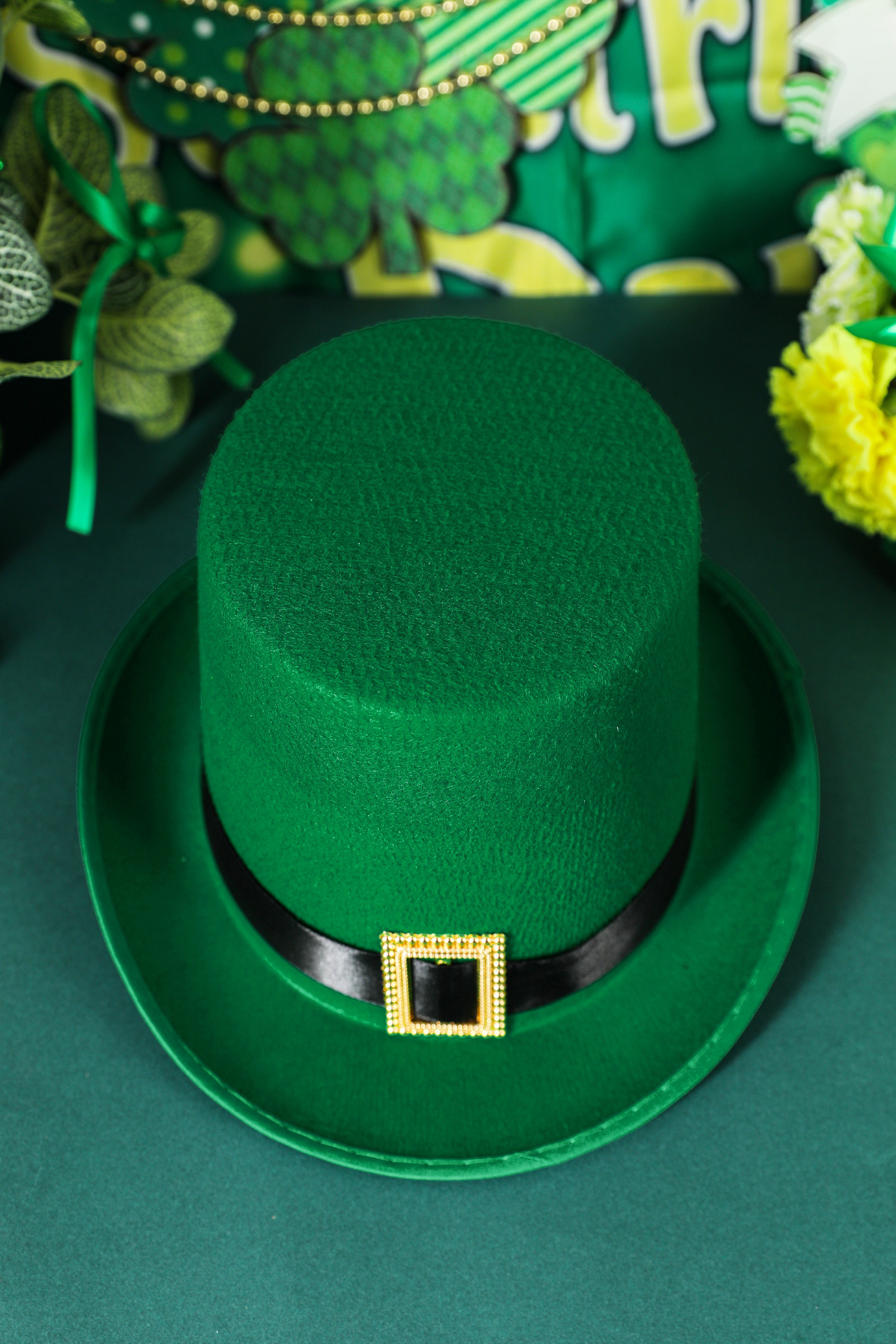 Chapeau de lutin vert foncé avec boucle contrastée et détails de luxe pour la Saint-Patrick