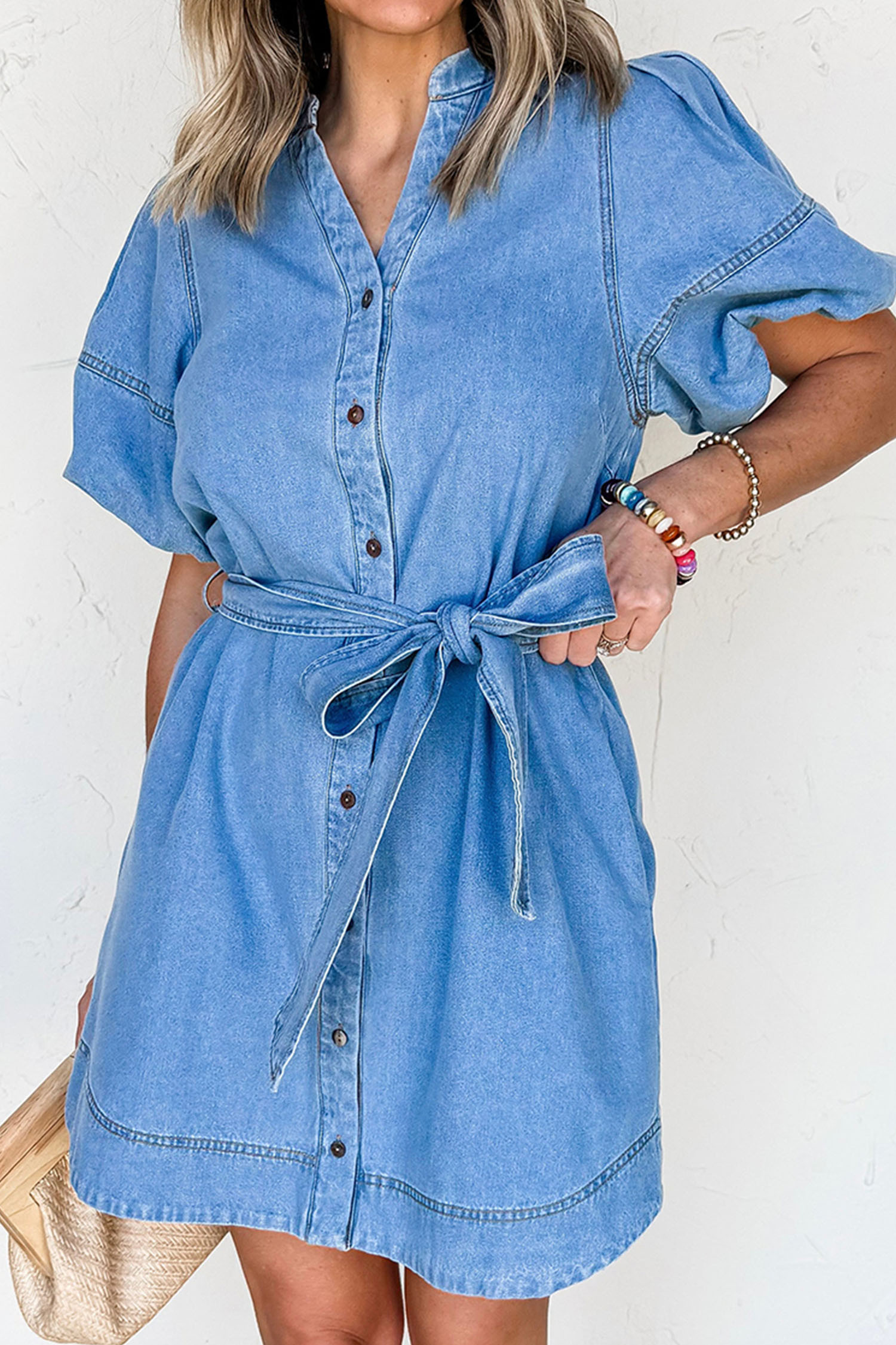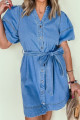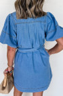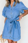 Robe en jean bleu crépuscule à manches bouffantes courtes et ceinture