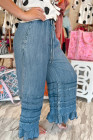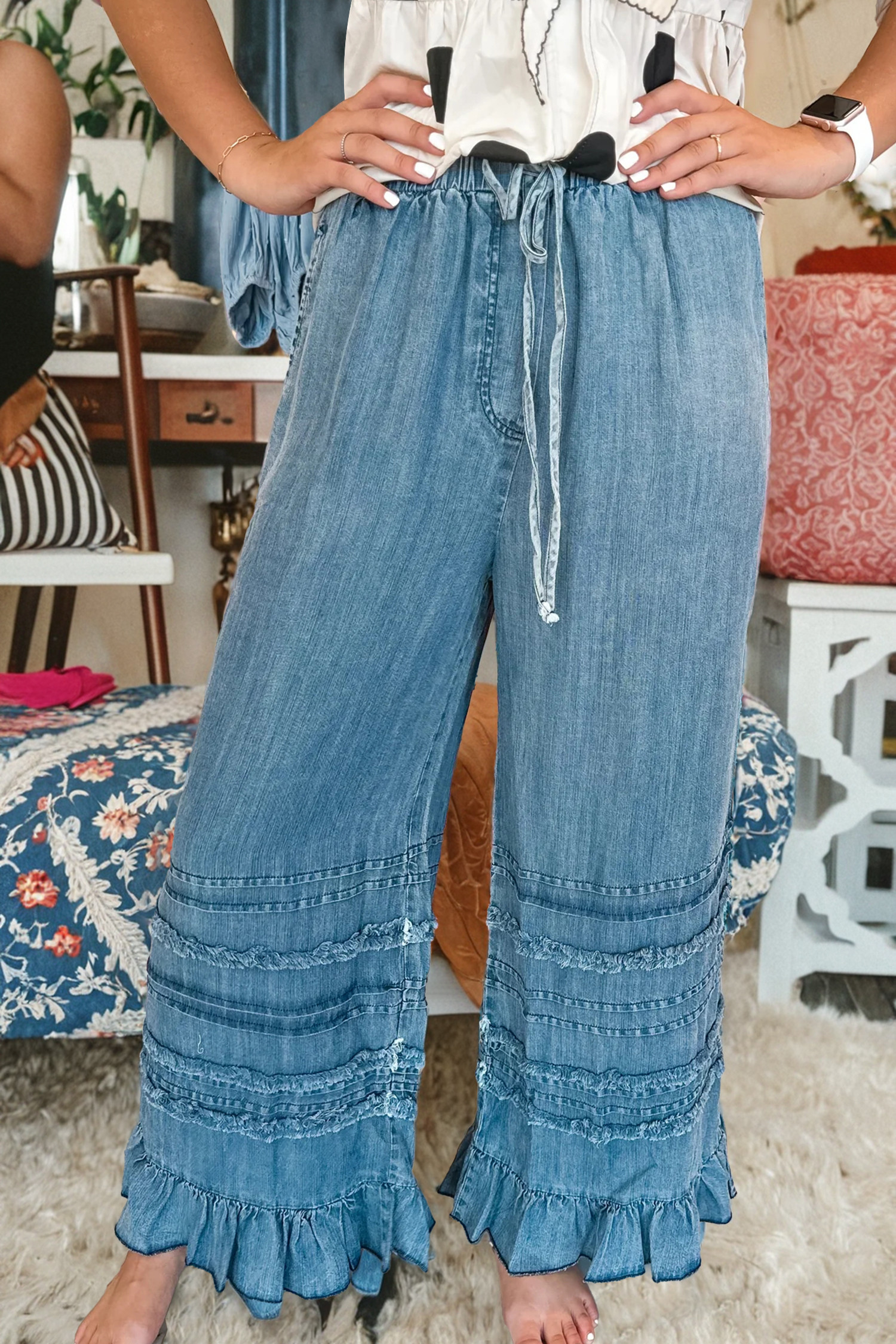 Pantalon en chambray bleu crépuscule à ourlet volanté et jambes larges