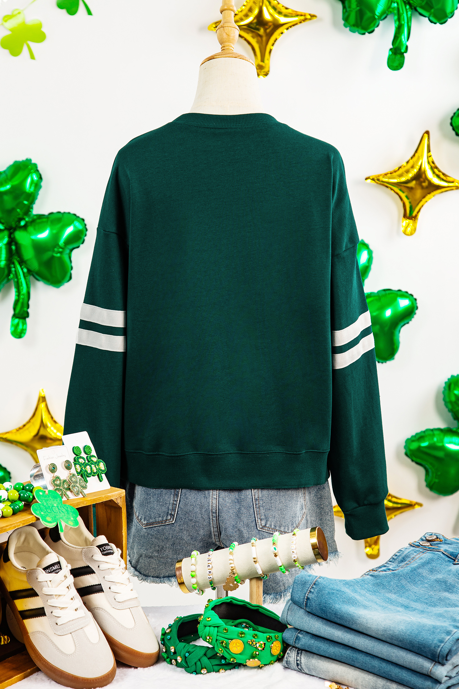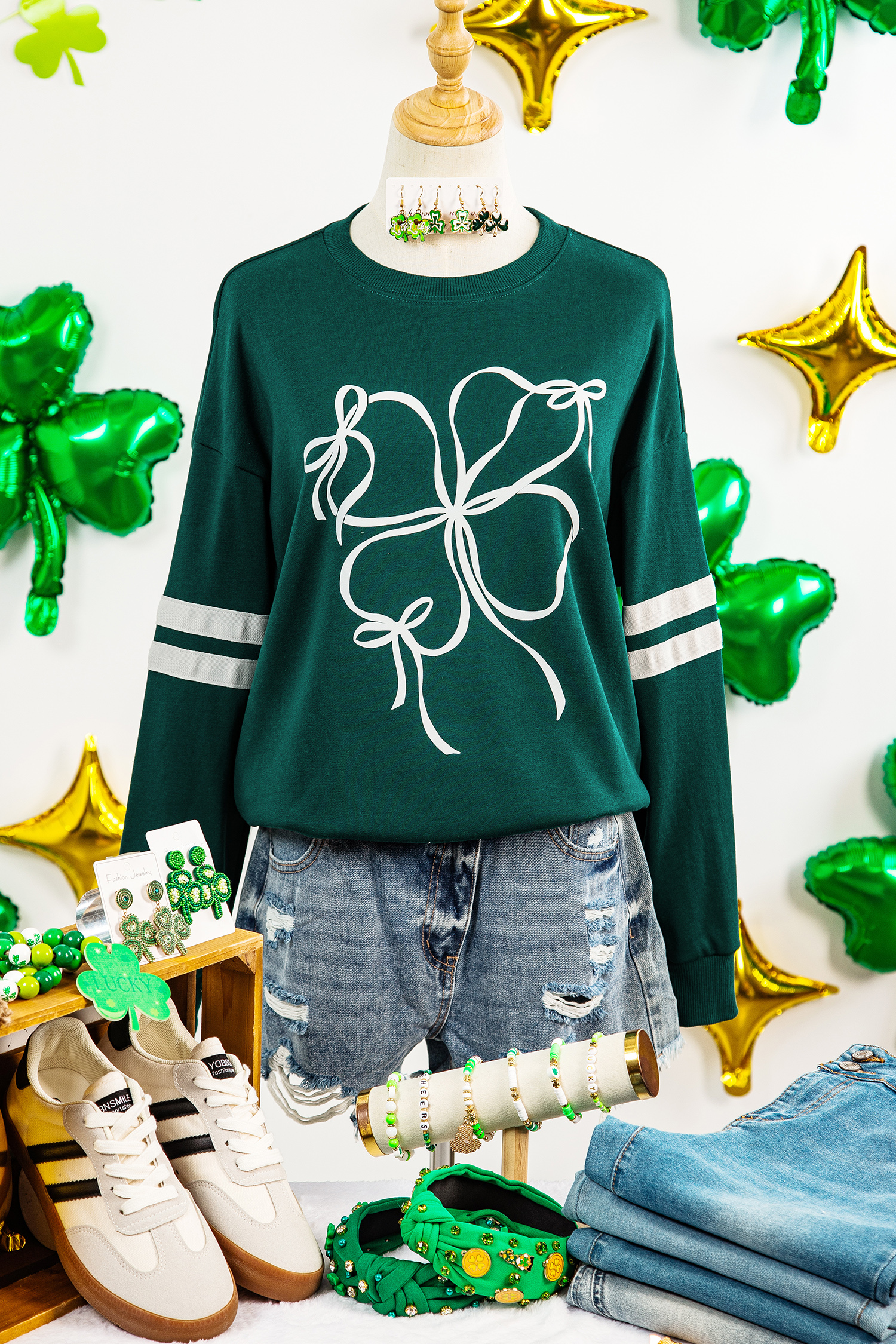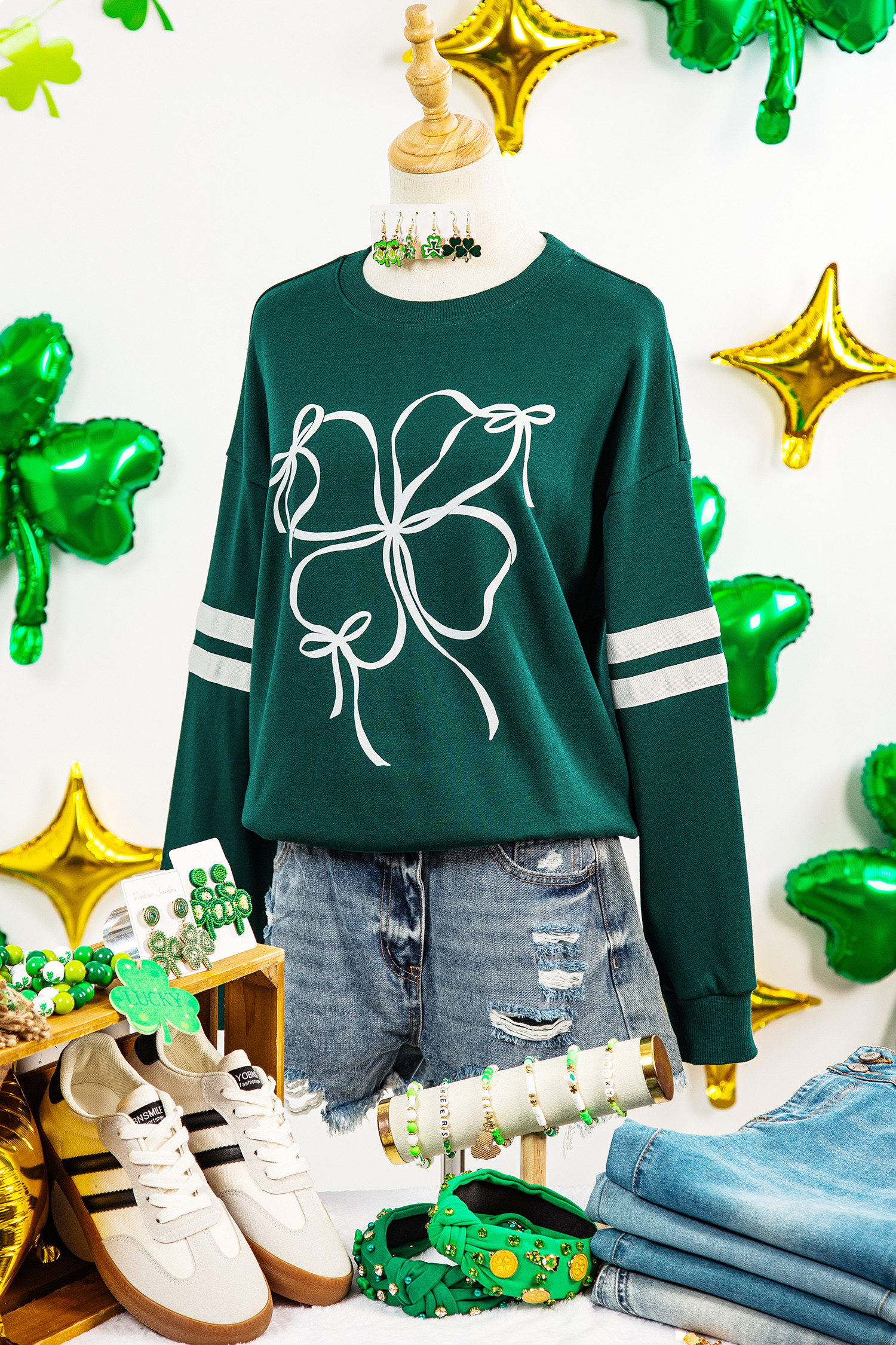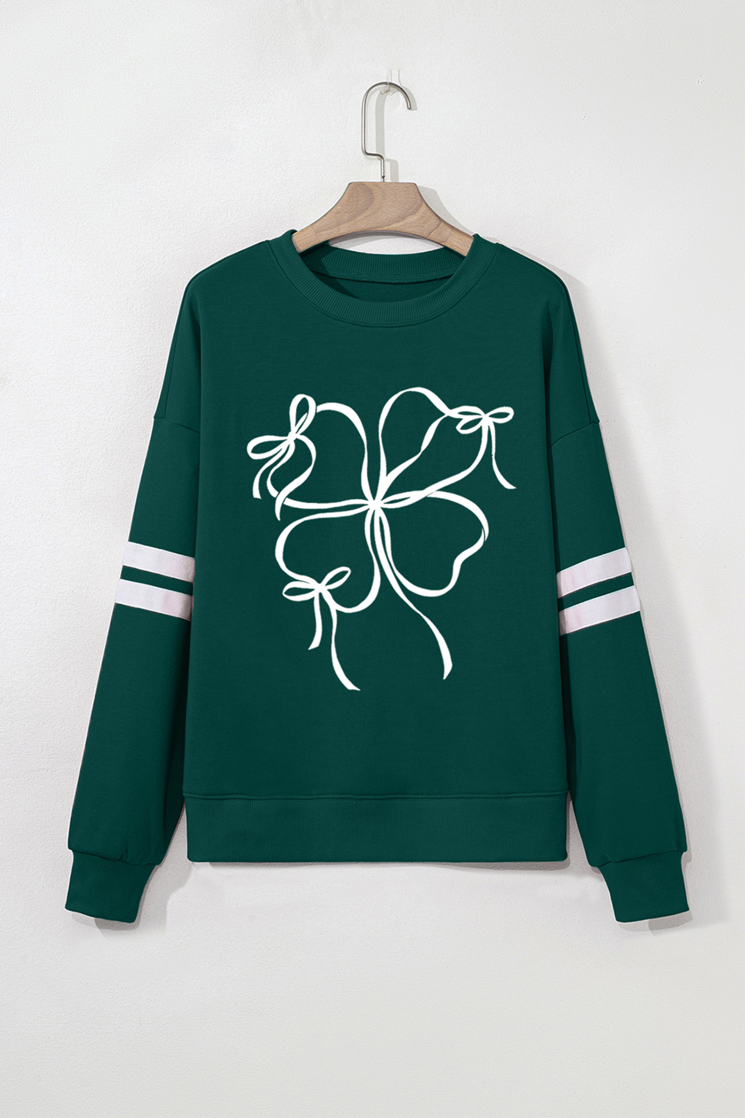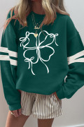 Sweat-shirt décontracté à manches rayées et nœud papillon Evergreen Ribbon Bow Lucky Clover, style universitaire