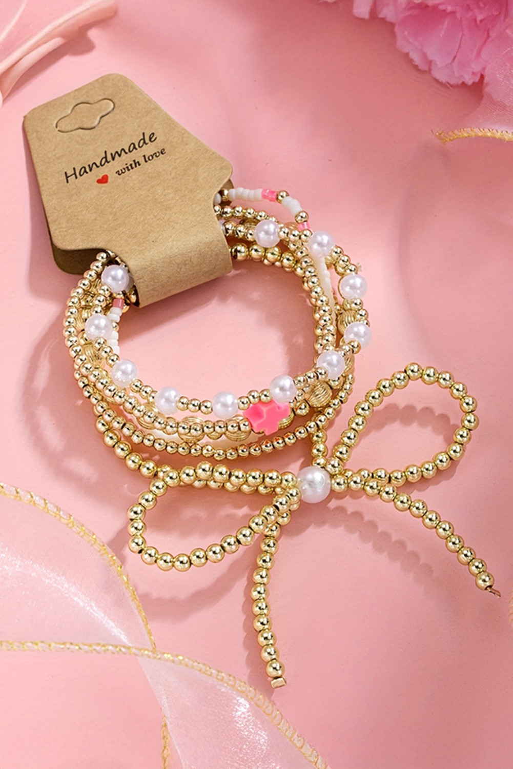 Bracelet multicouches plaqué or avec nœud papillon et perles décoratives