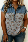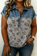 Polo en denim patchwork à imprimé floral rétro gris, grande taille