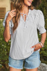 Chemisier à rayures grises, col V, manches bouffantes mi-longues et détails froncés. Col V à rayures grises.