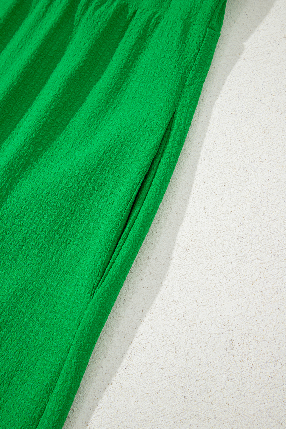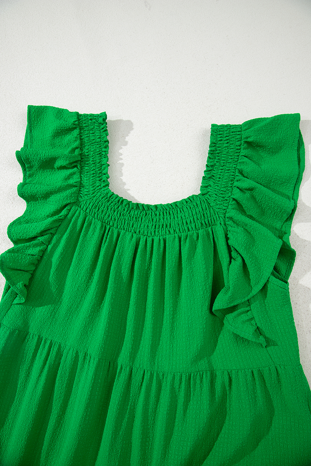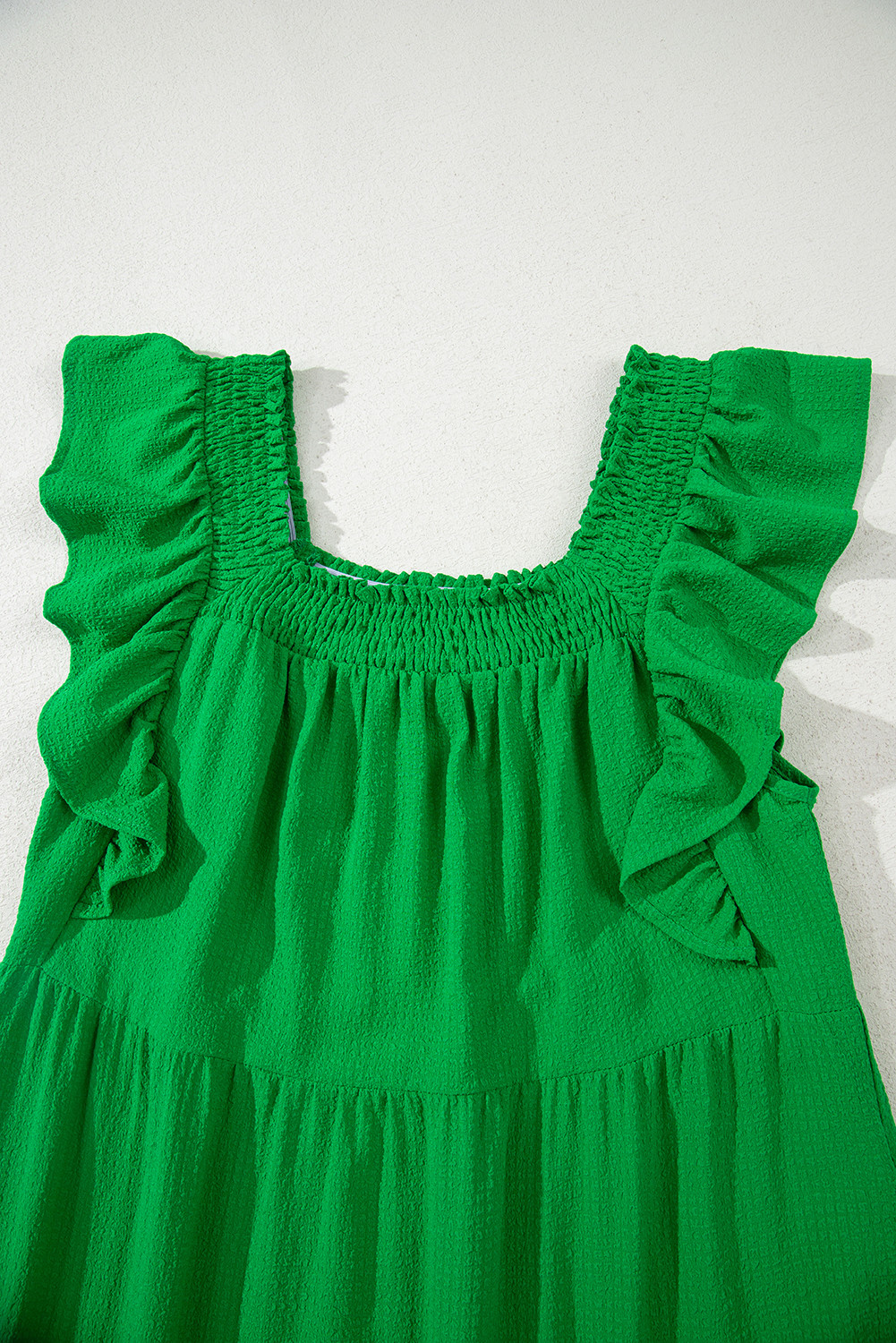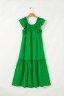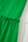 Robe longue verte à volants, manches flottantes, col carré, texturée et à volants