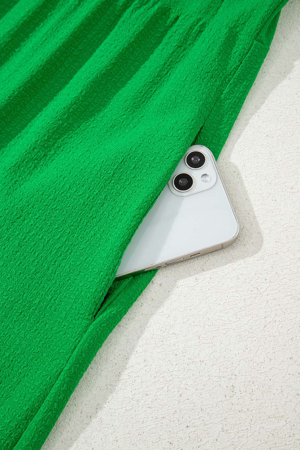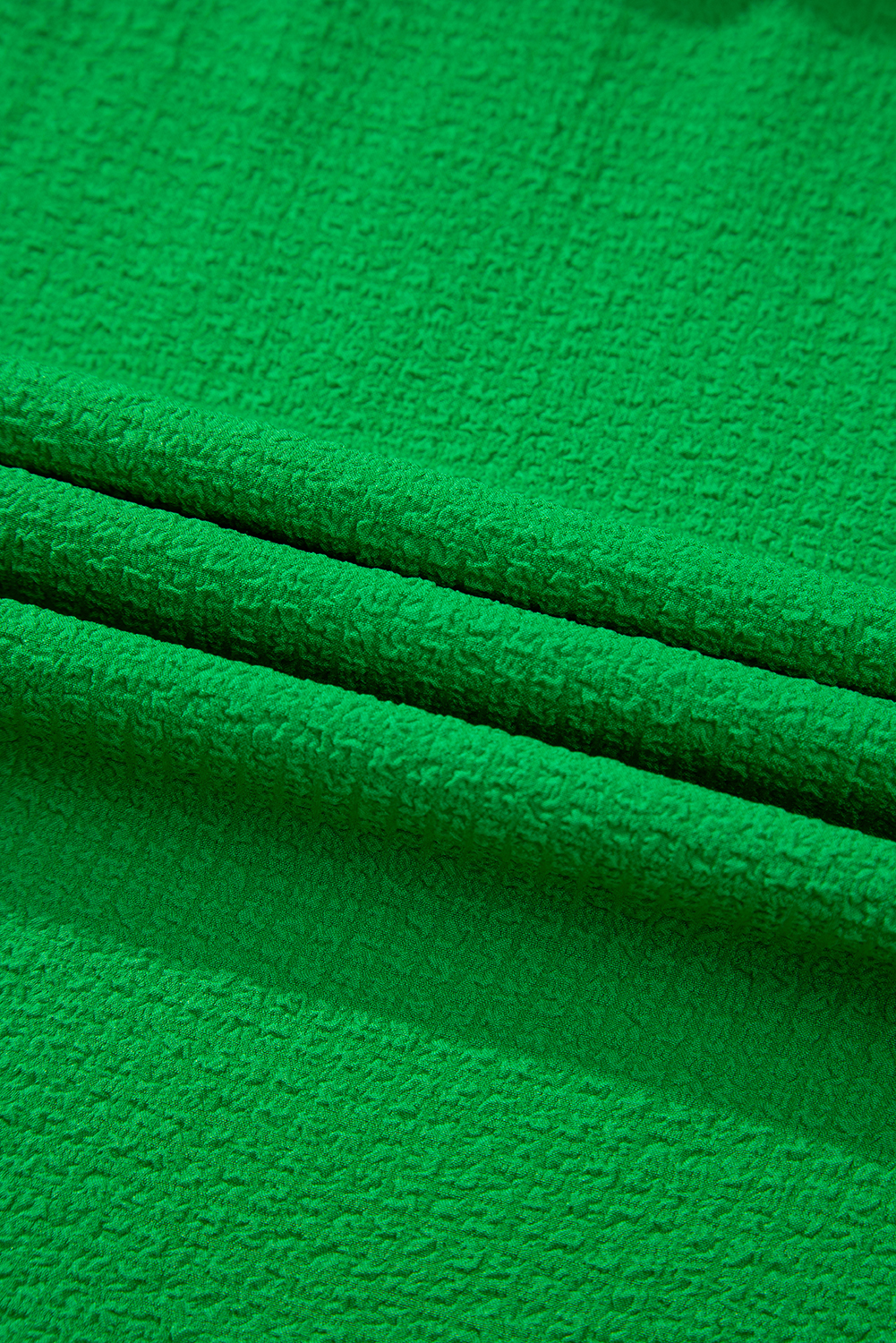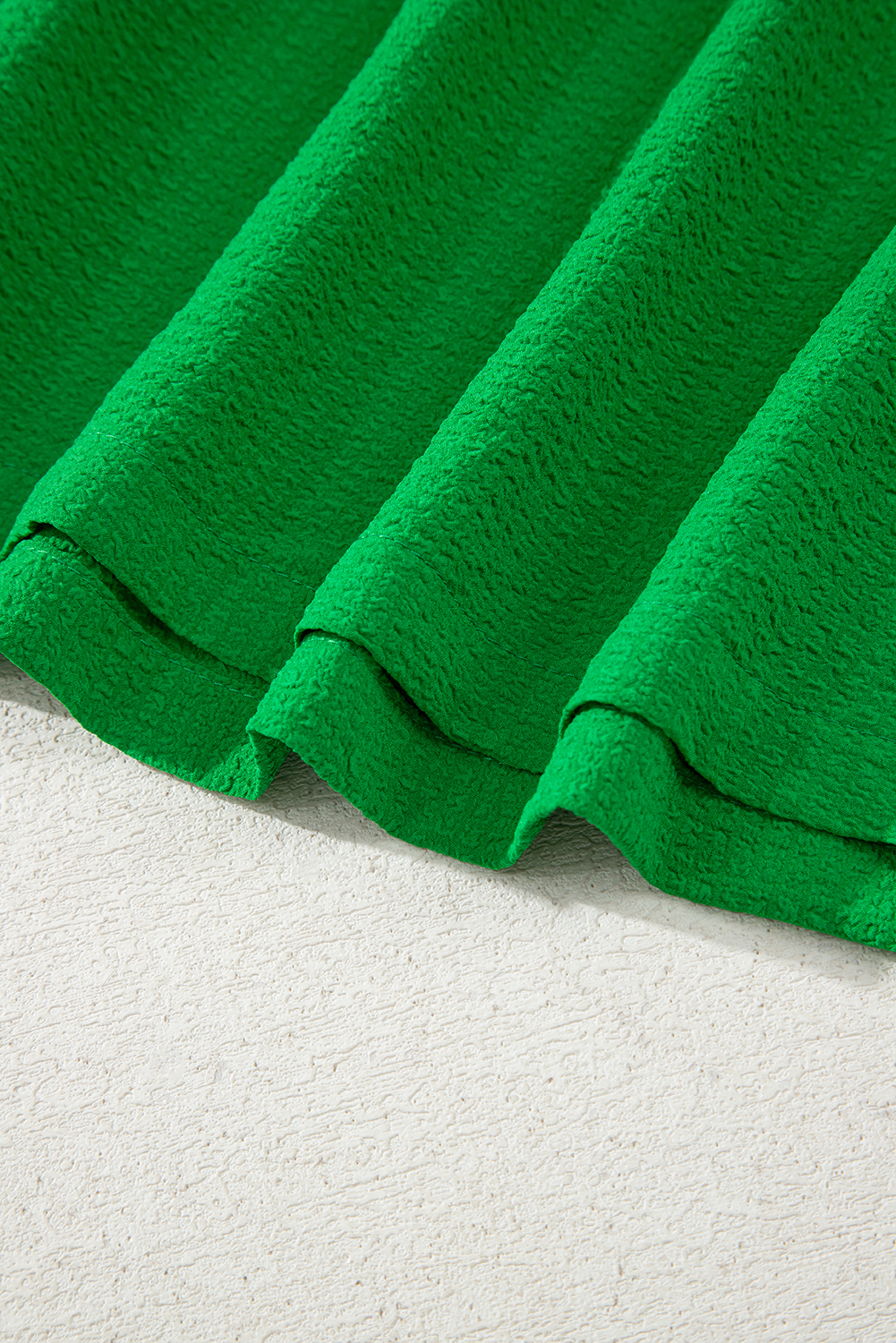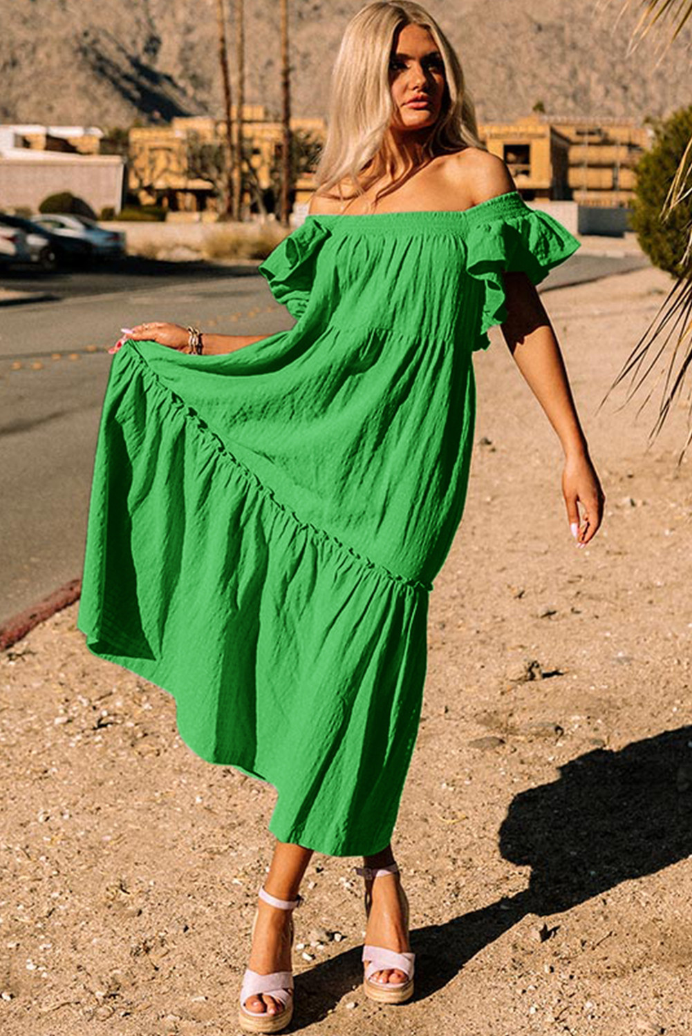 Robe longue verte à volants, manches flottantes, col carré, texturée et à volants