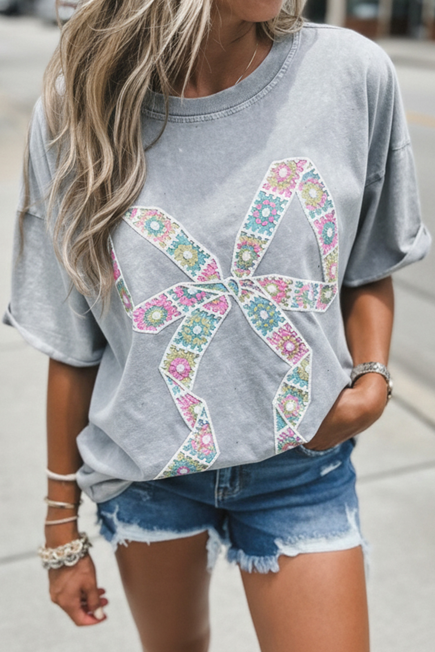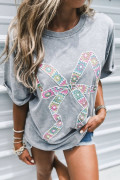 T-shirt gris clair à motif floral et nœud papillon au crochet, délavé à l'huile minérale
