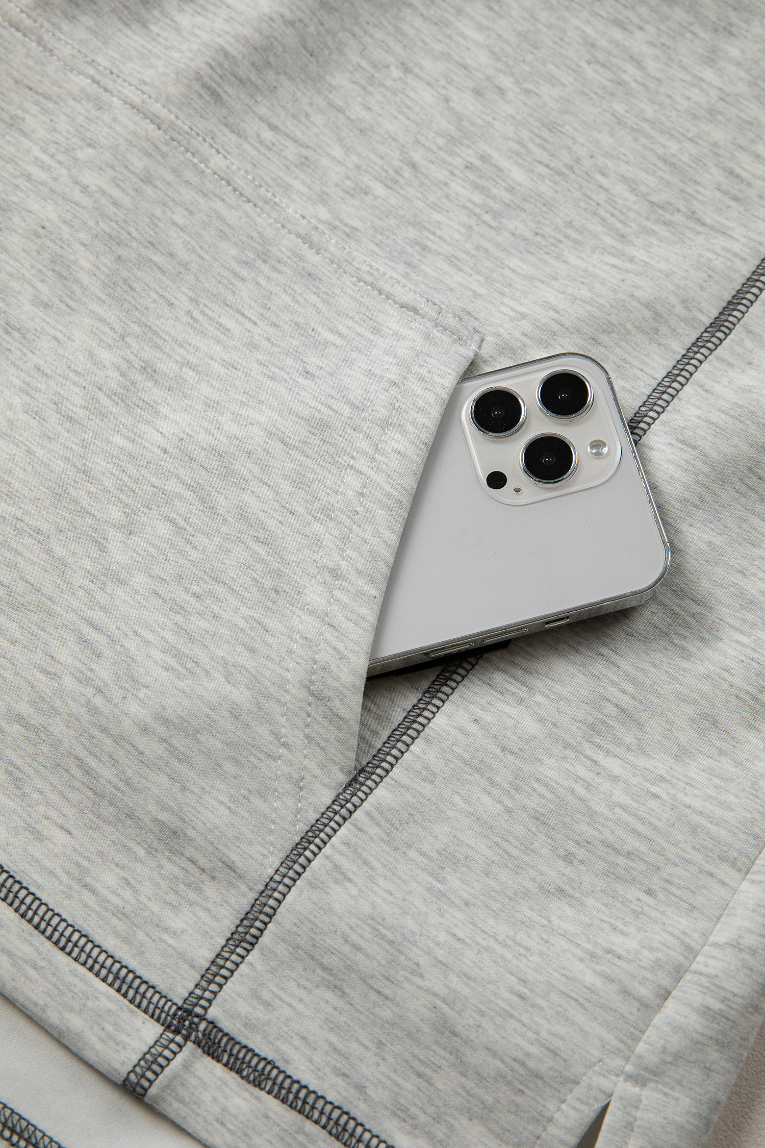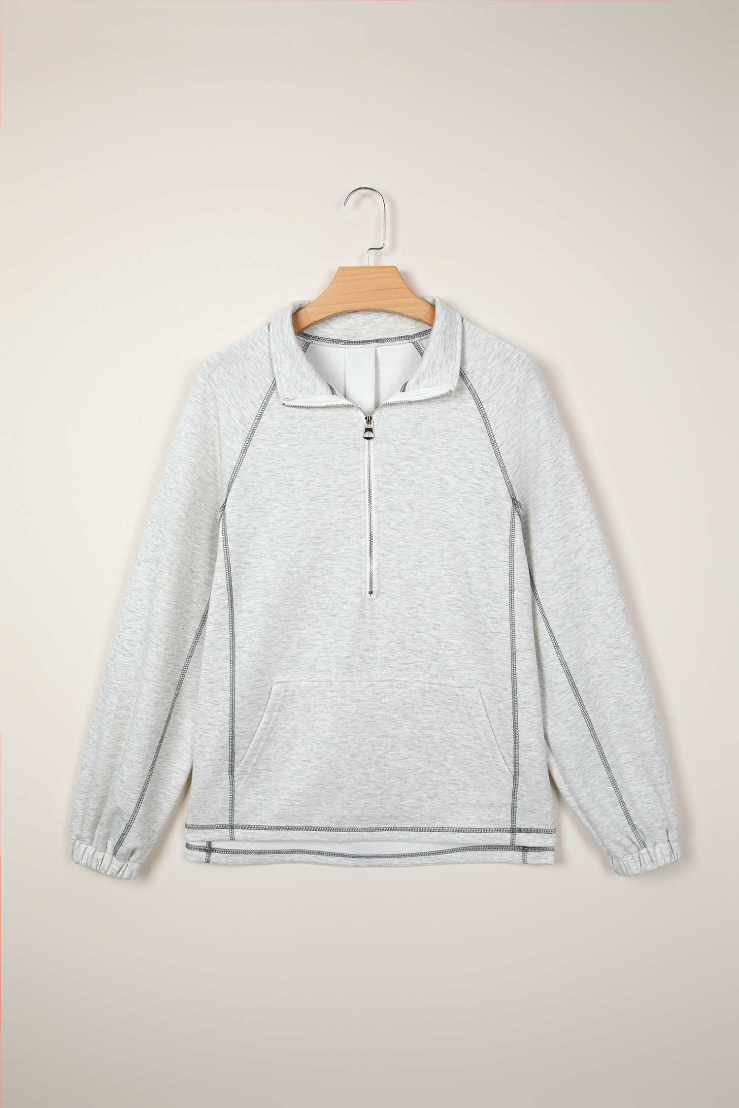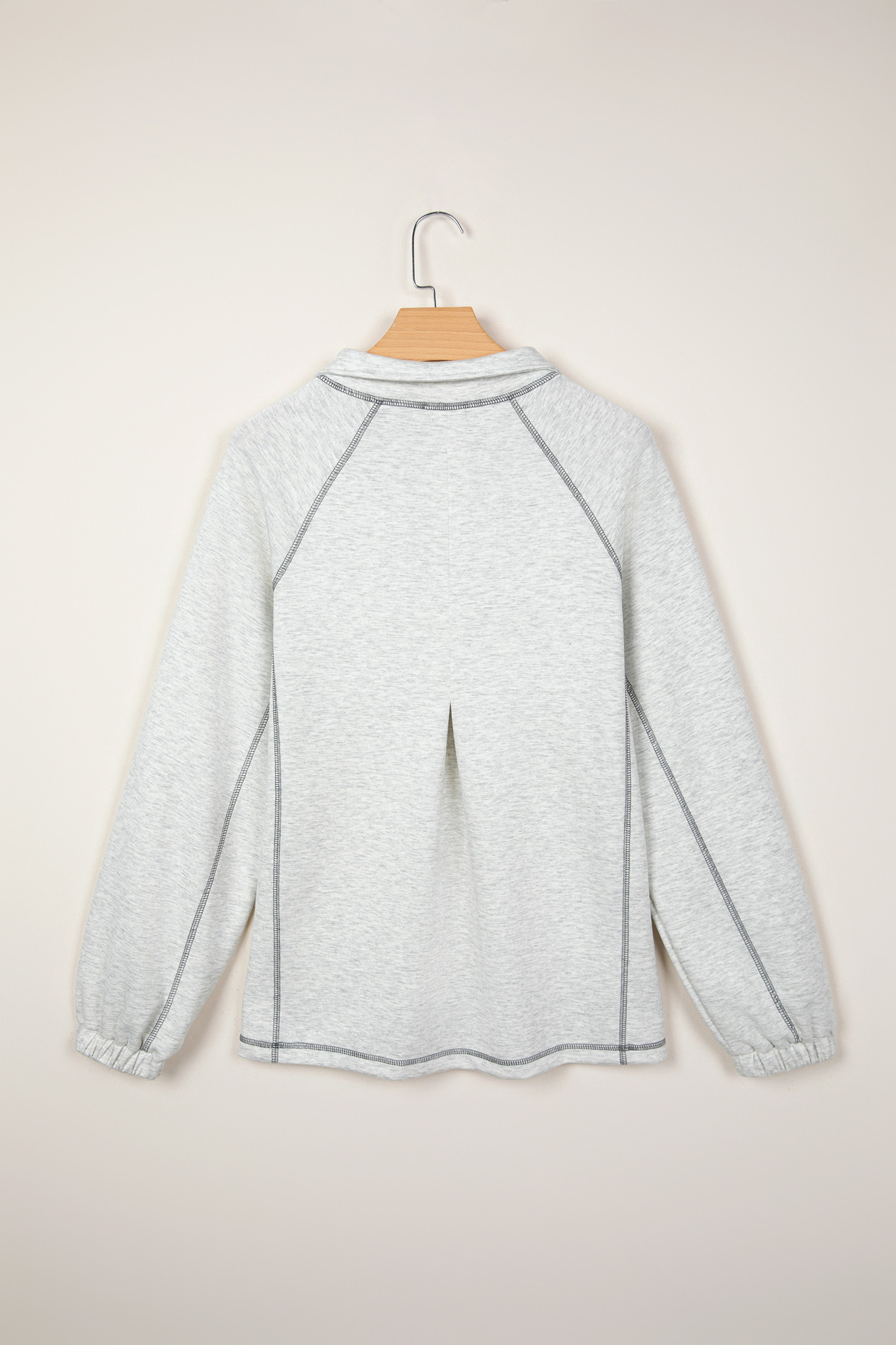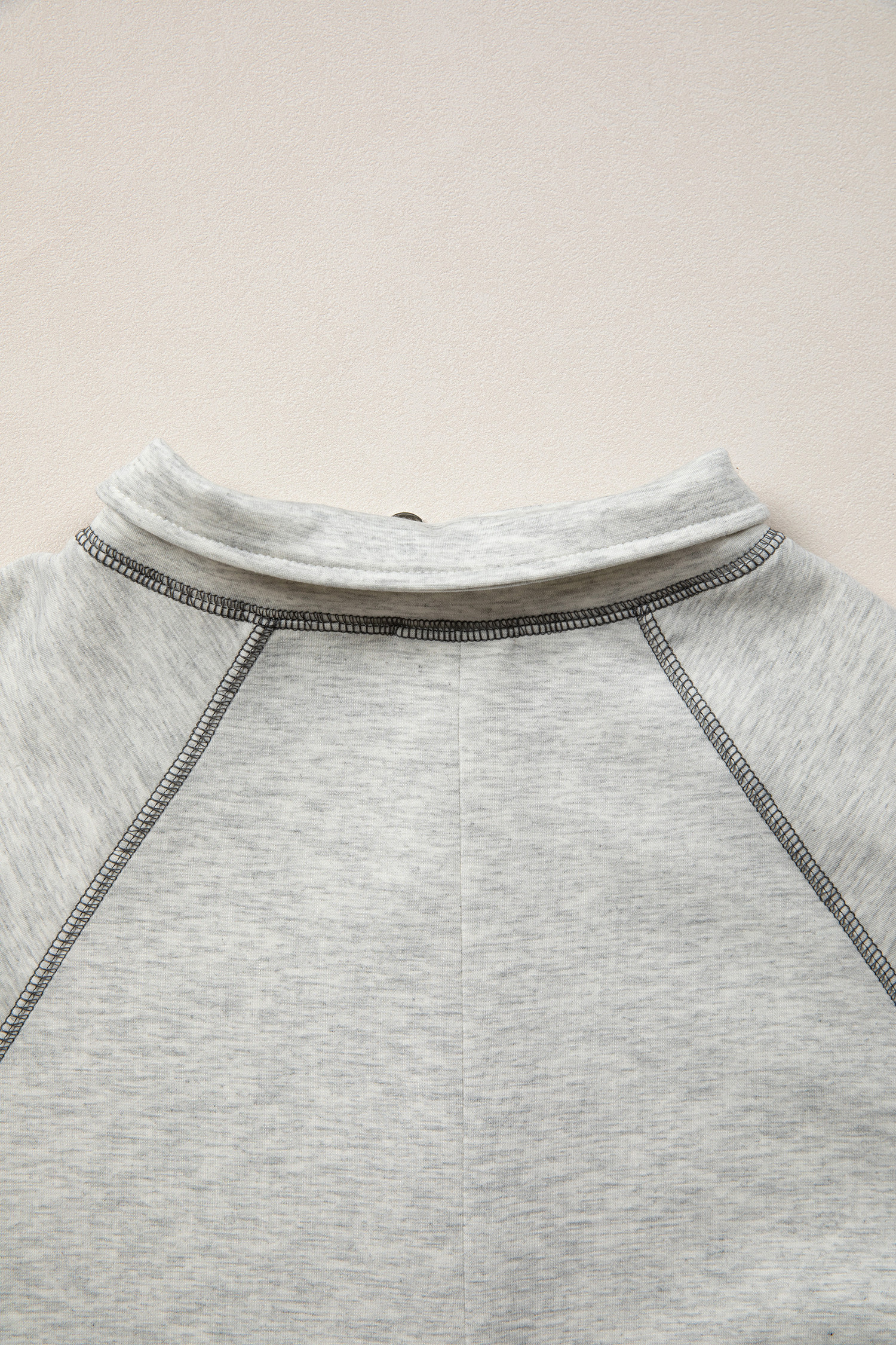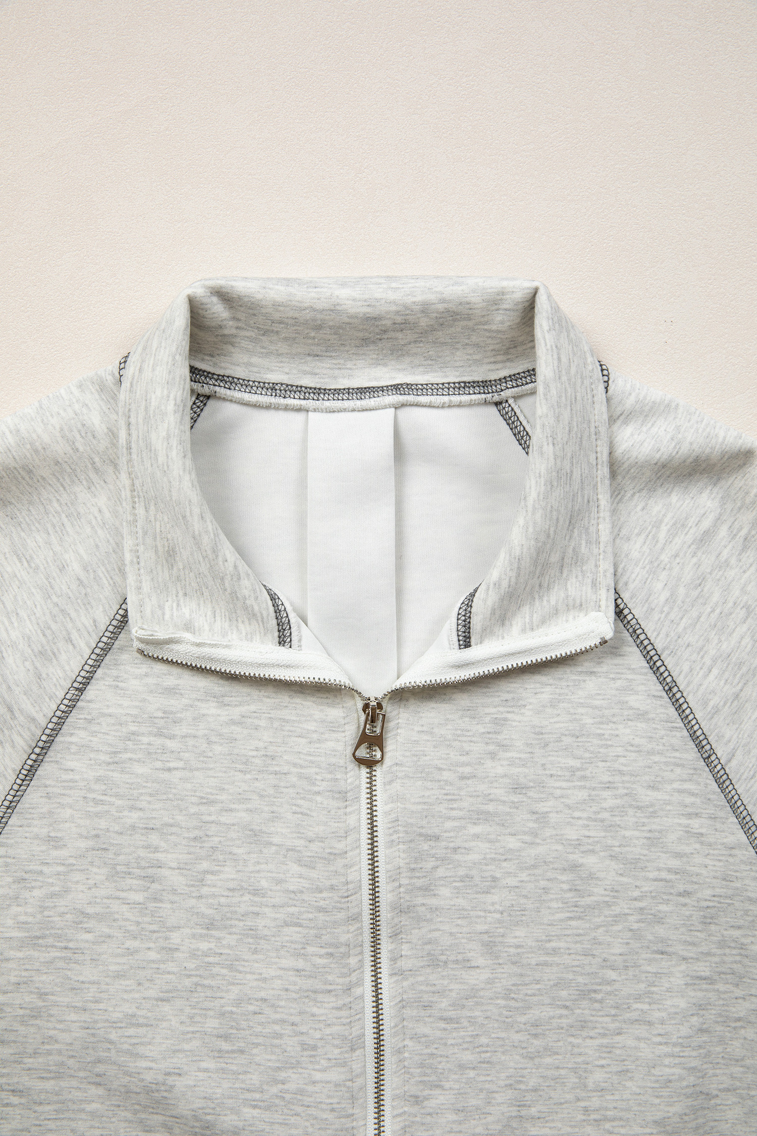 Haut gris clair à demi-zip, col montant et manches longues, détail coutures apparentes