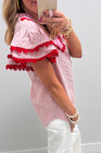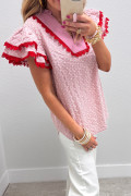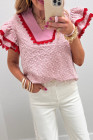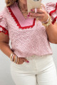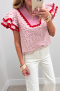 Chemisier rose à œillets brodés de fleurs et à manches papillon, orné de dentelle contrastée et de dentelle à effet œillet.