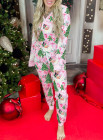 Ensemble de détente 2 pièces rose à motif de Noël, pull à col en V et pantalon à cordon de serrage