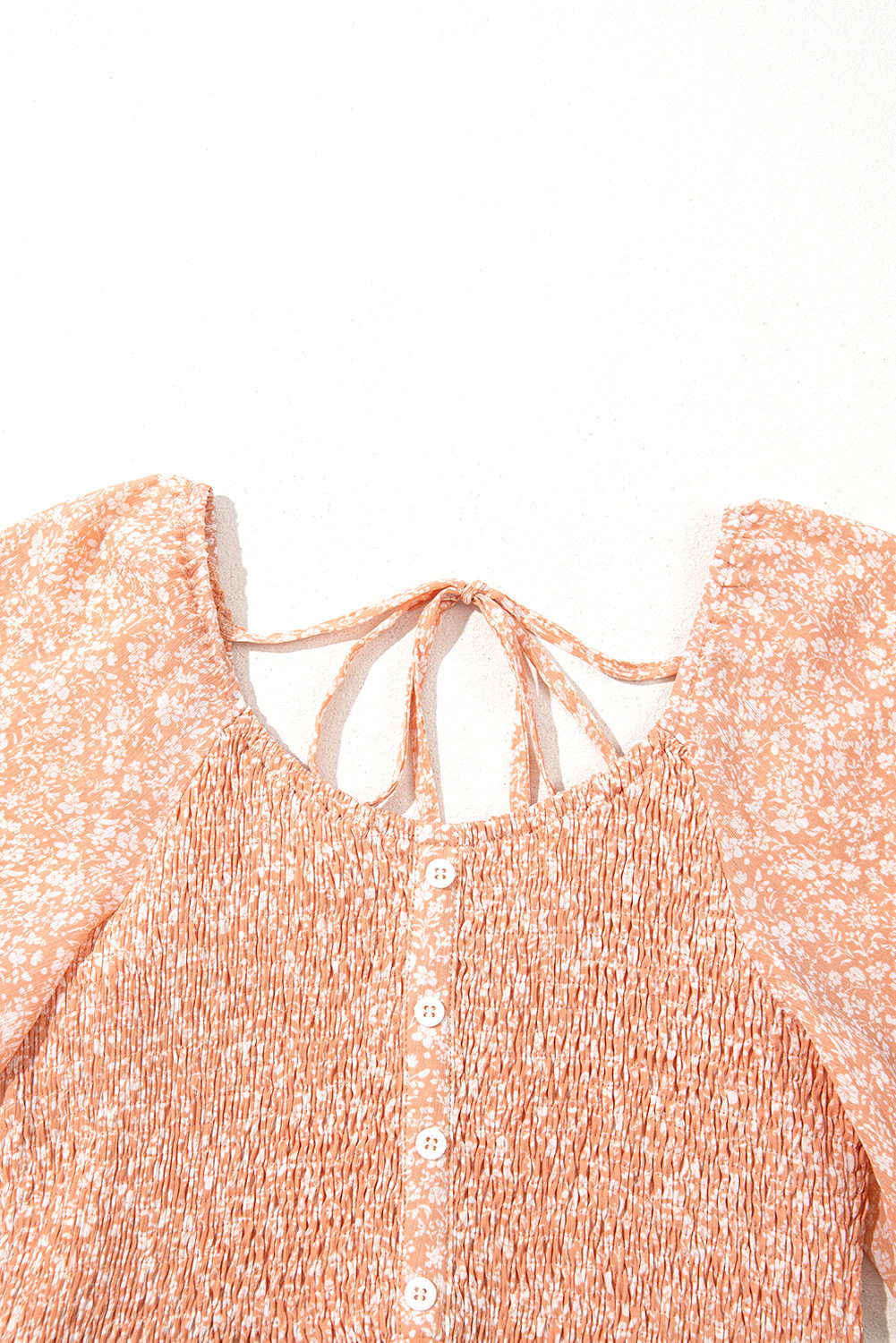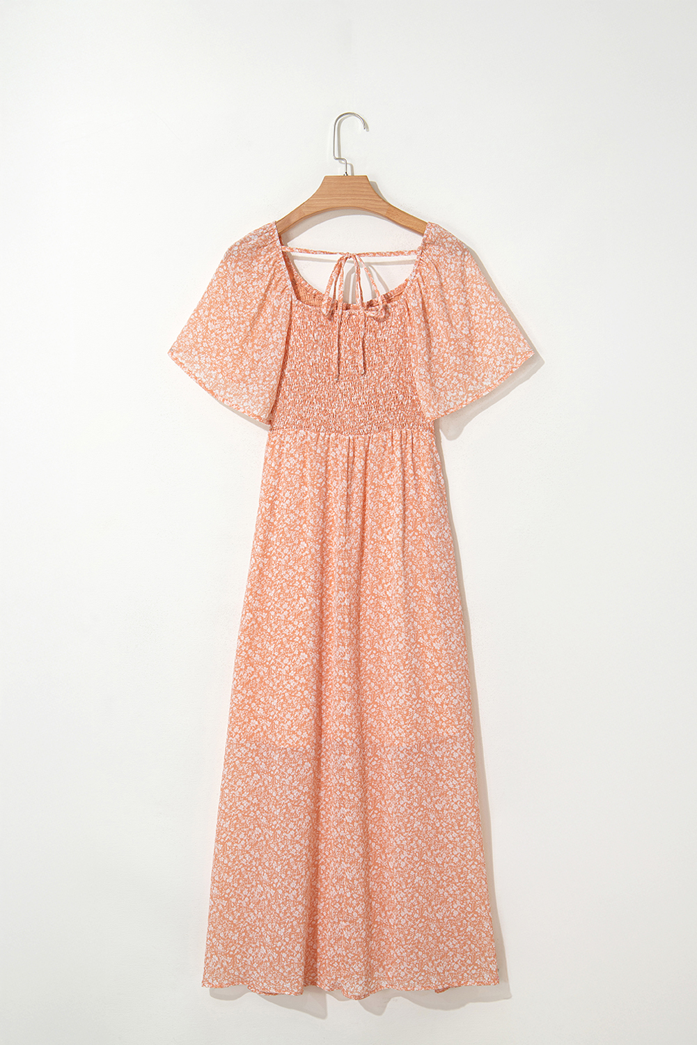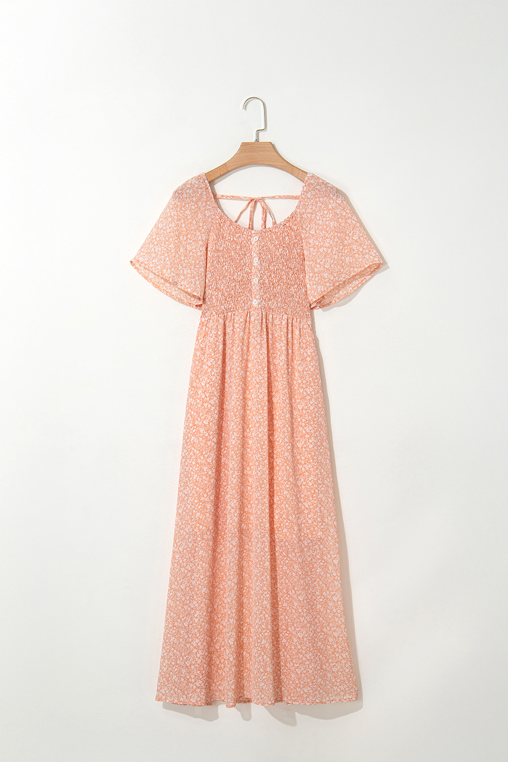 Robe longue rose à imprimé floral et corsage smocké boutonné