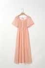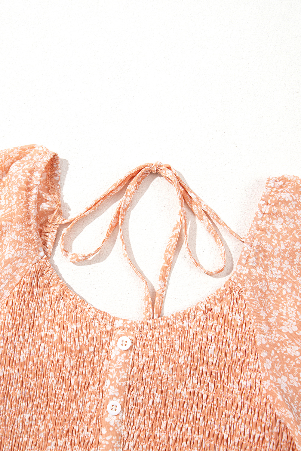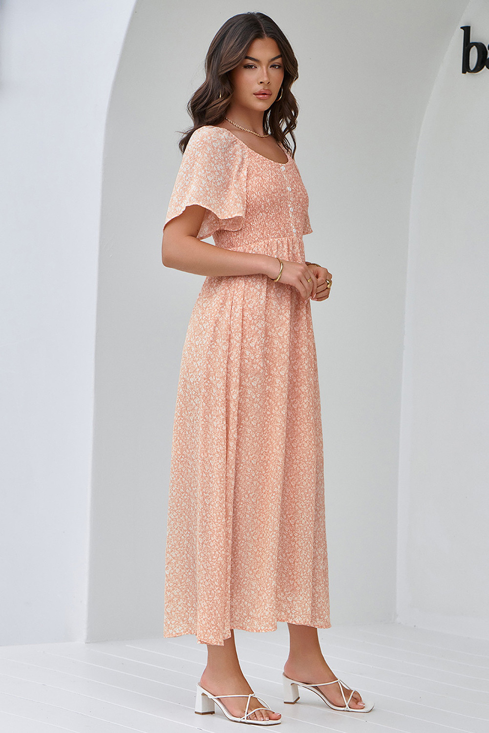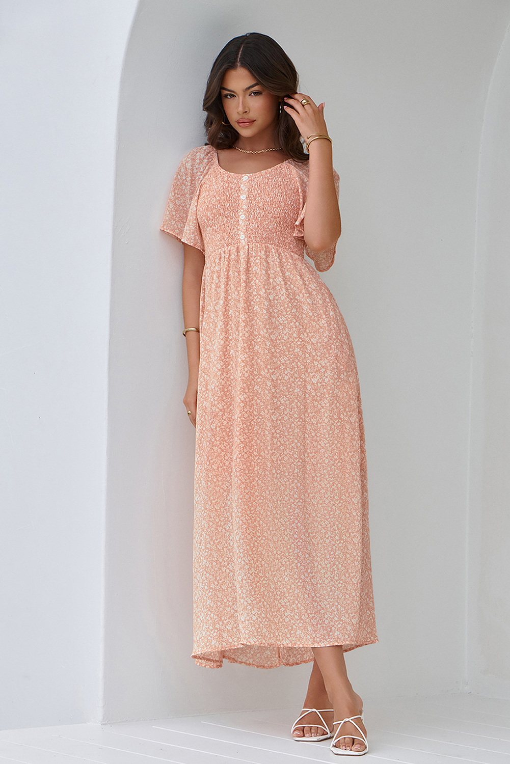 Robe longue rose à imprimé floral et corsage smocké boutonné