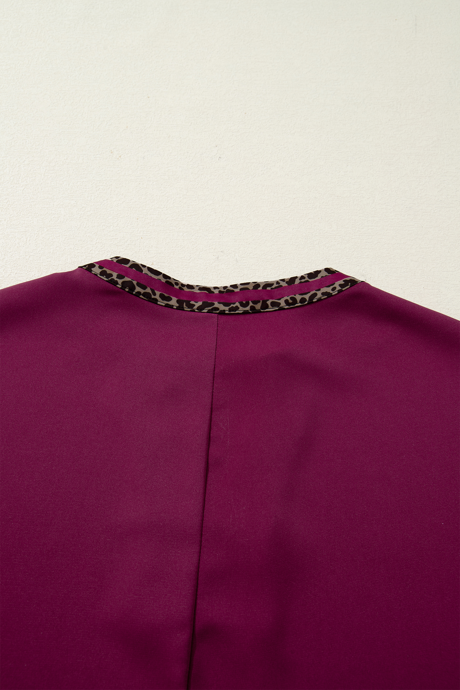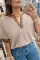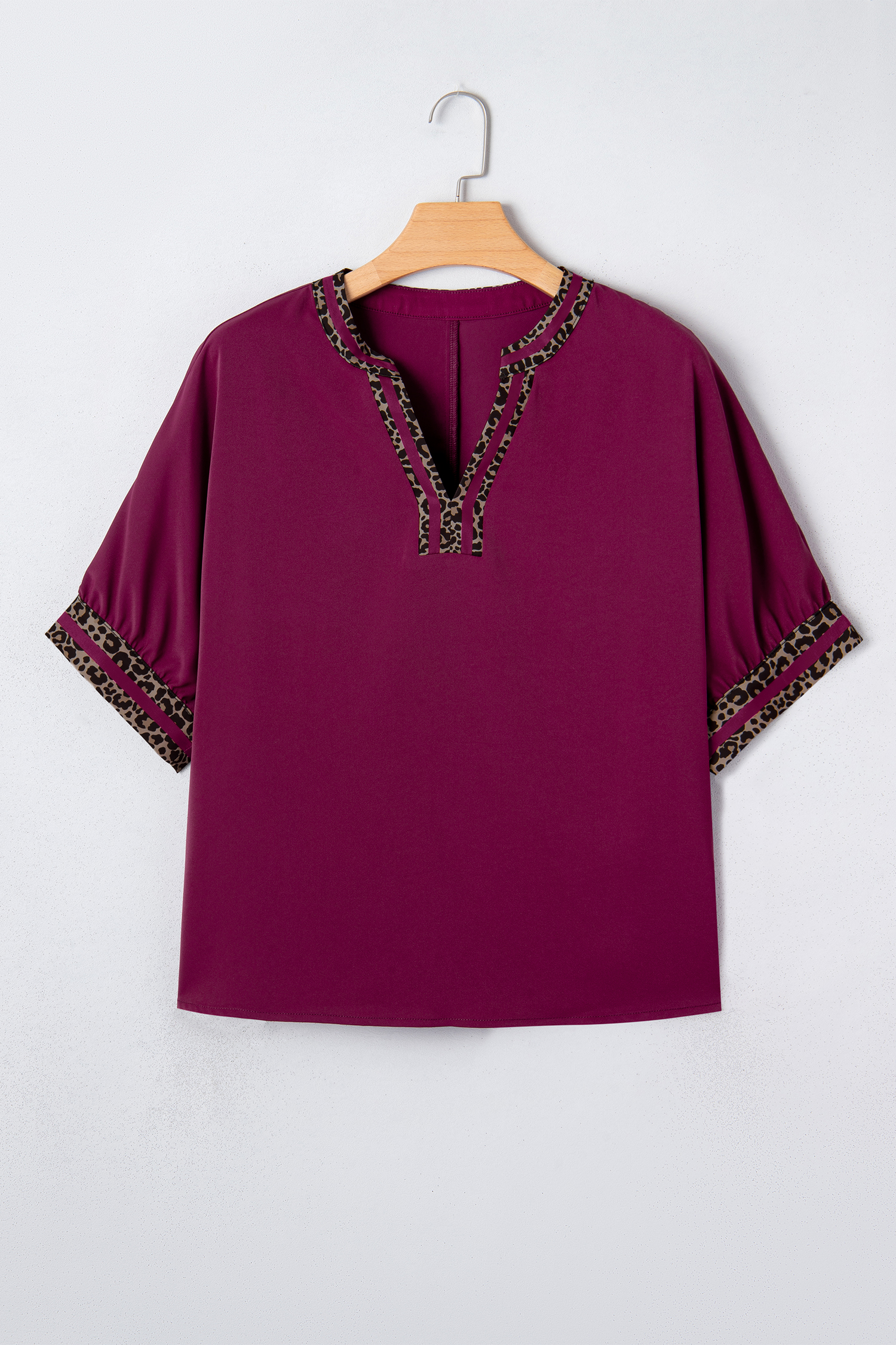 Chemisier rouge à manches courtes et col en V, orné de détails léopard contrastés, style Dahlia