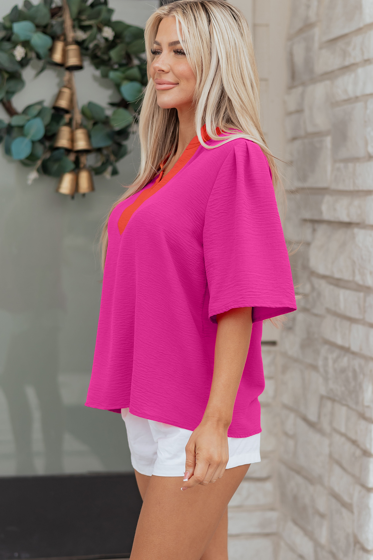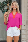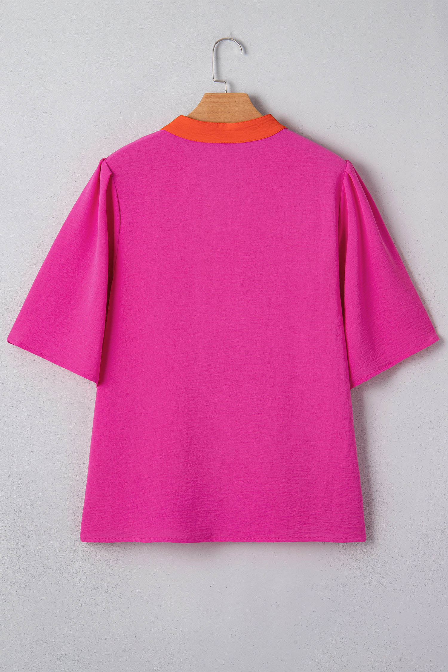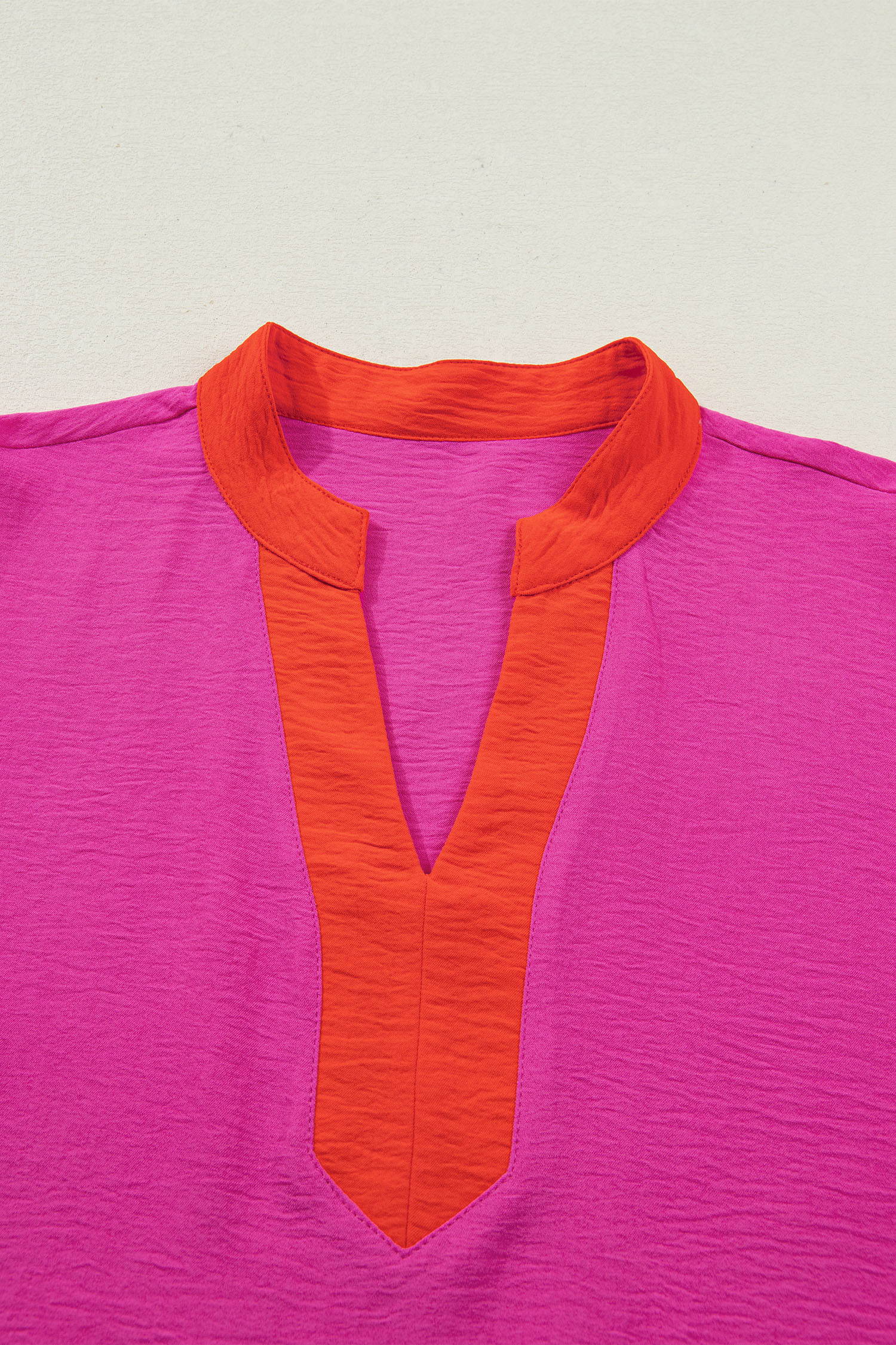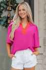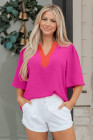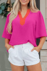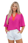 Haut à manches courtes larges et col en V contrasté rose rouge