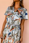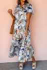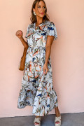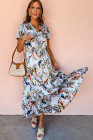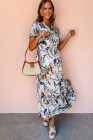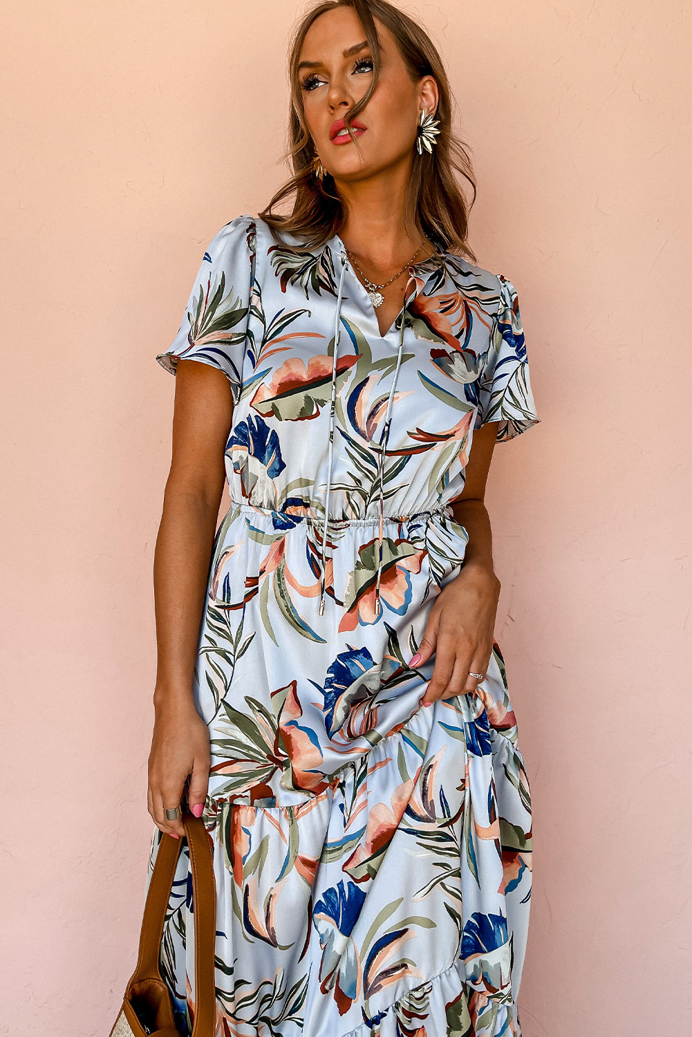 Robe longue à taille haute et col en V avec cordon de serrage et imprimé floral bleu ciel