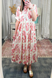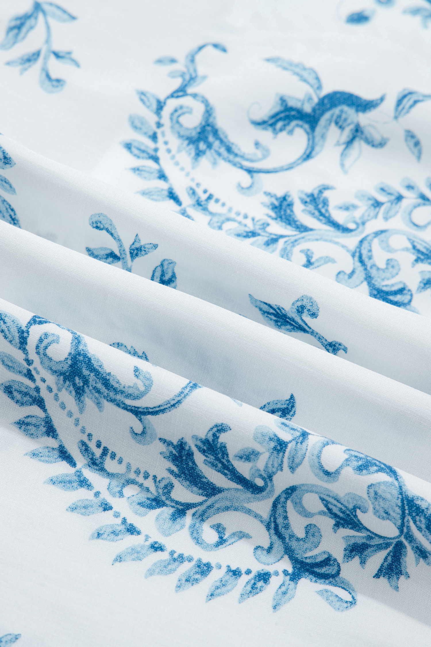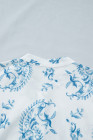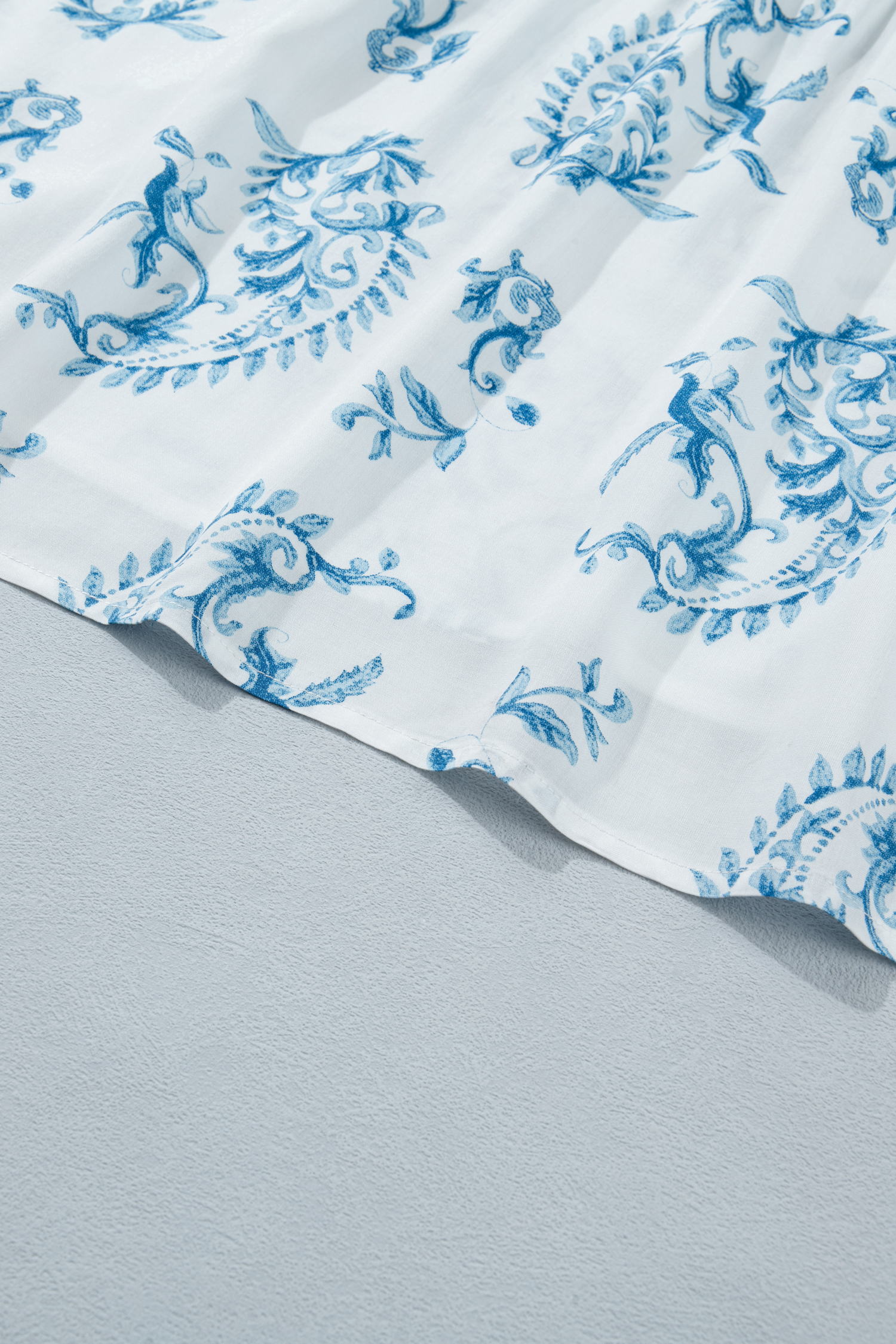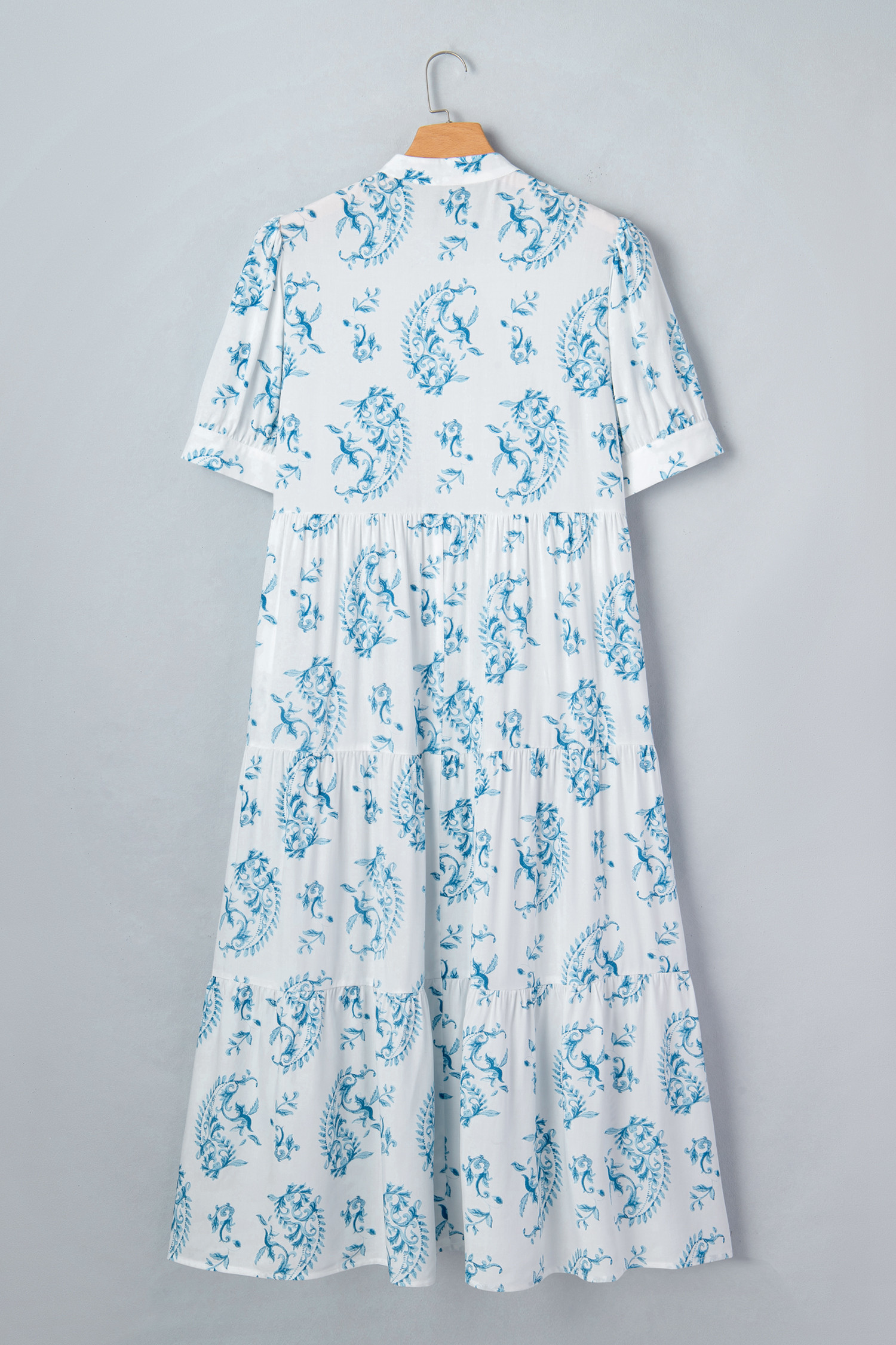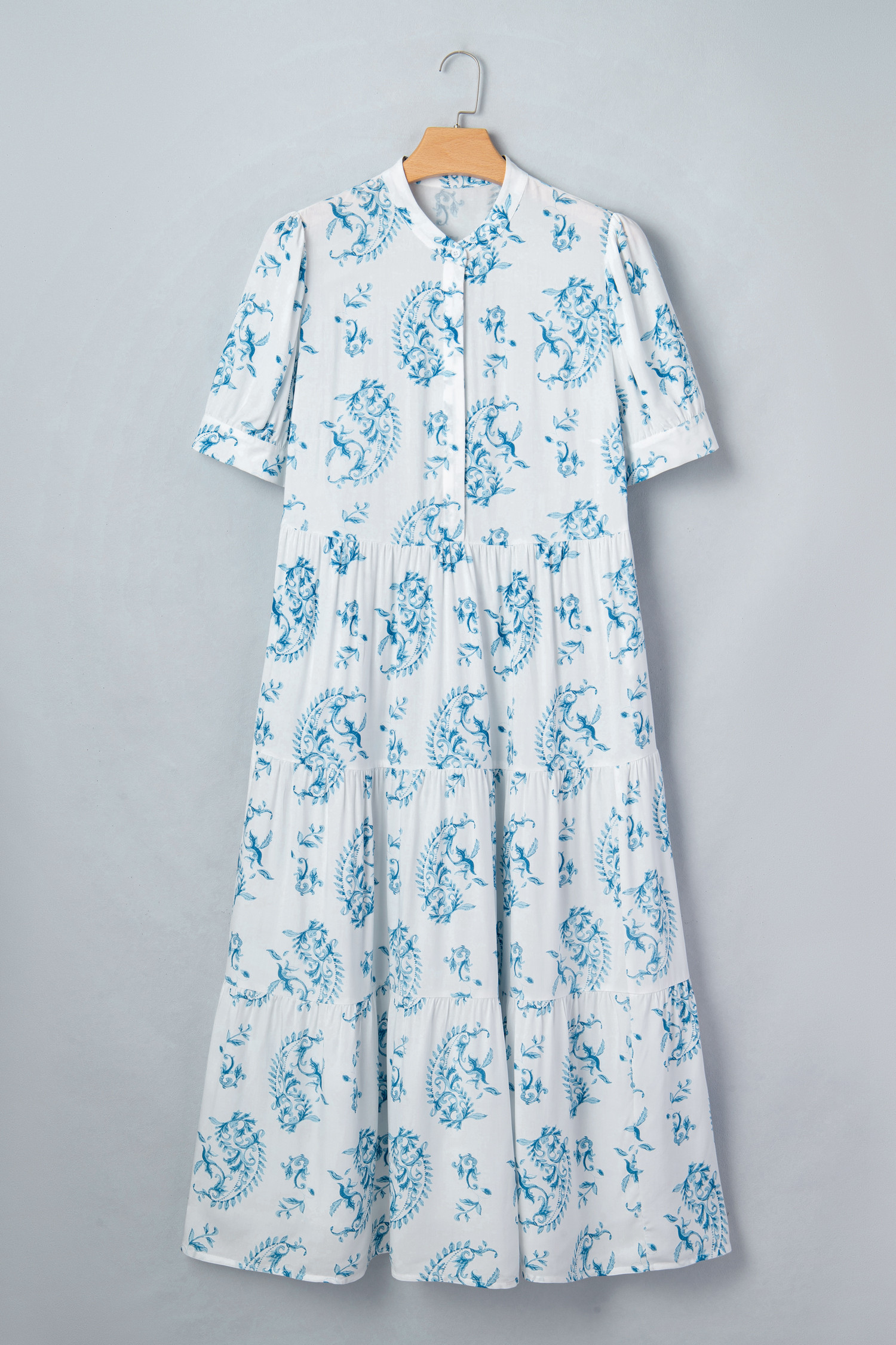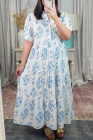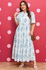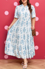 Robe longue bleu ciel grande taille à imprimé floral géométrique et boutons, col fendu, manches courtes