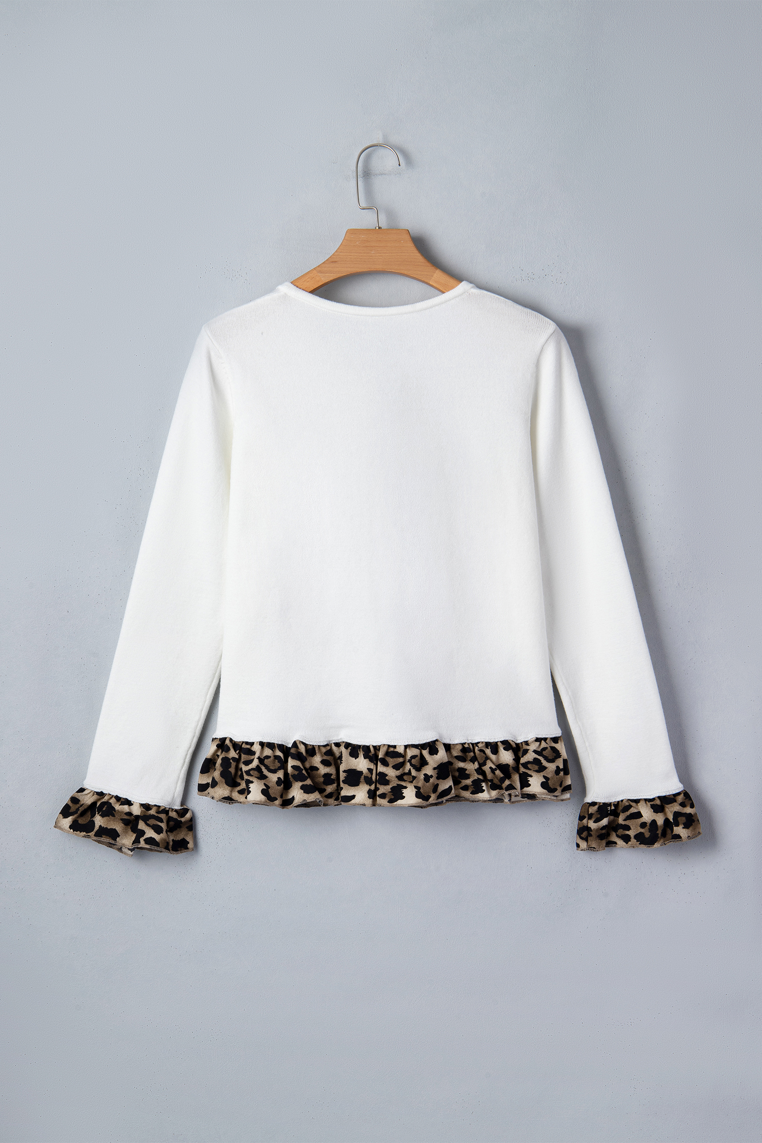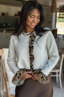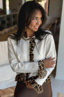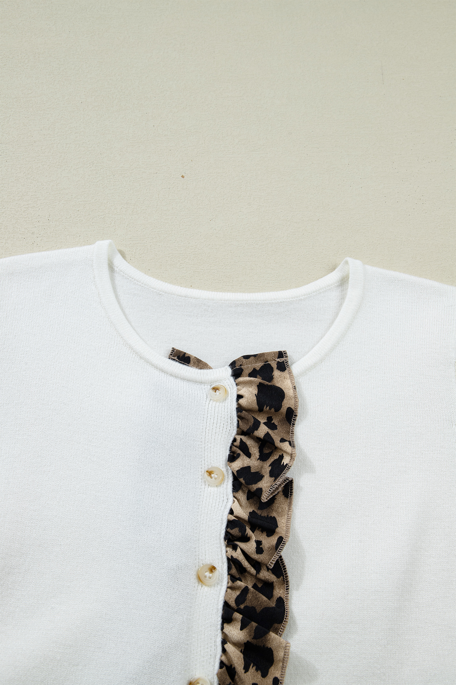 Gilet court boutonné à volants et patchwork léopard en maille blanche